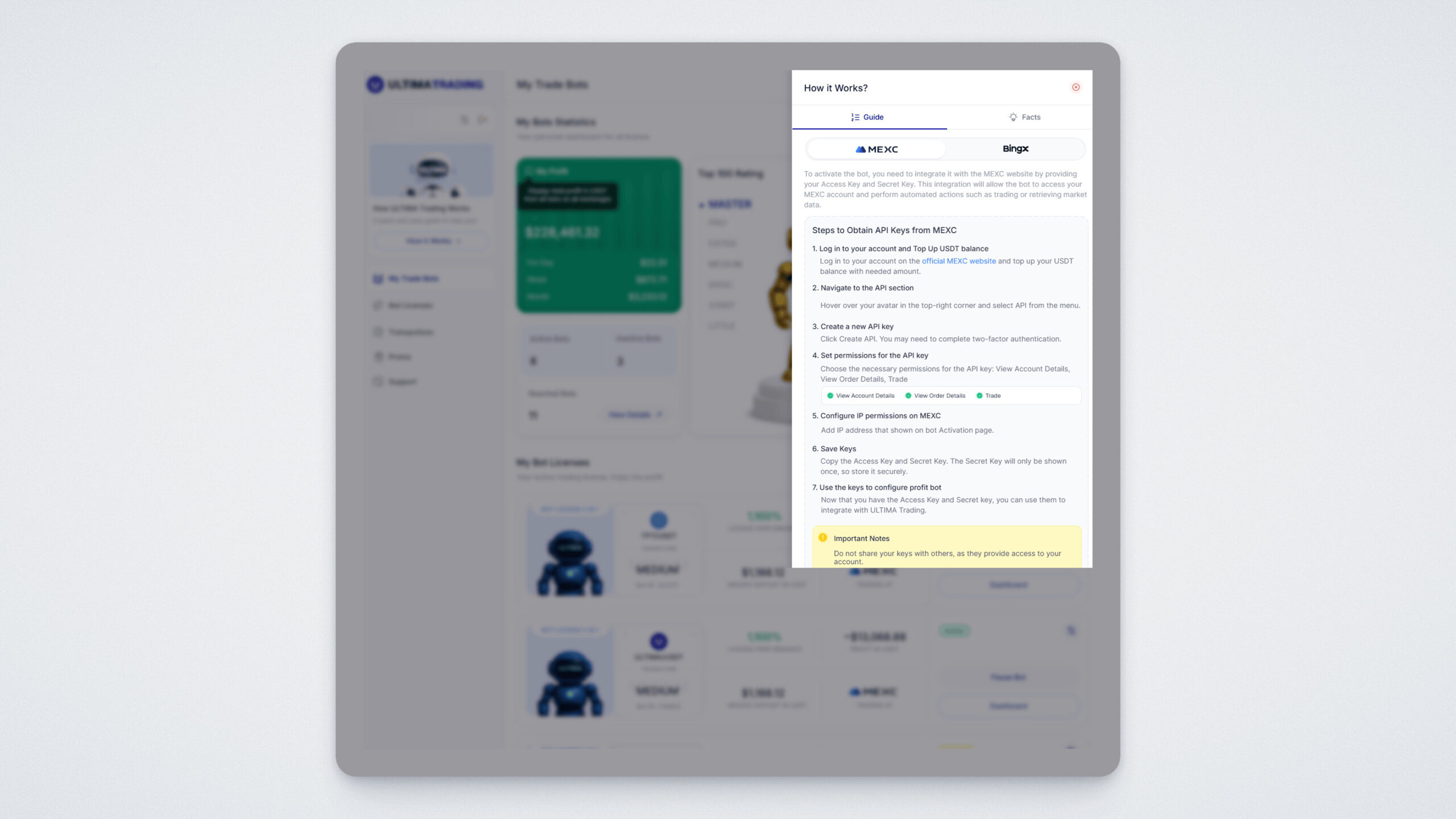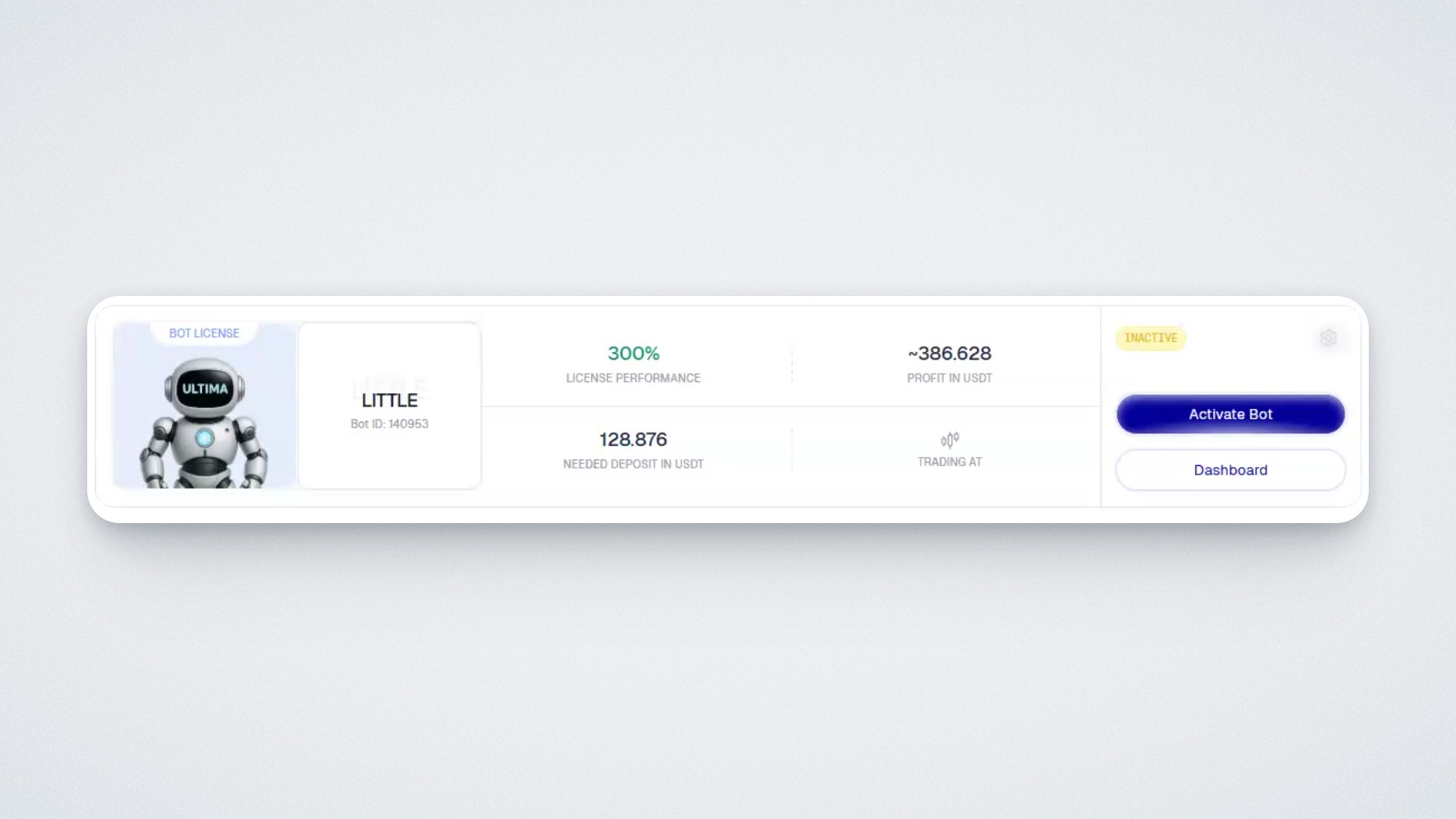 За да започнете да получавате печалба, трябва да закупите лиценз и да свържете акаунта си на борсата с бота — той ще търгува по зададени алгоритми и ще ви носи печалба. За да започнете, е нужно да си създадете акаунт в една от поддържаните криптовалутни борси и да го заредите със средства. Подробни инструкции за създаване на акаунт в MEXC или BingX ще откриете в Help Center, в раздела „Борси“.