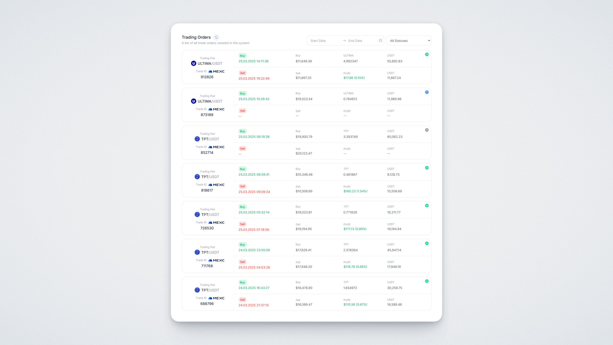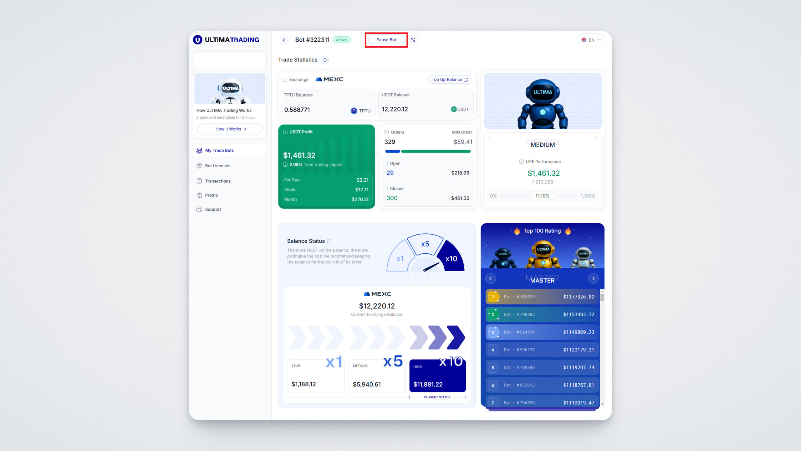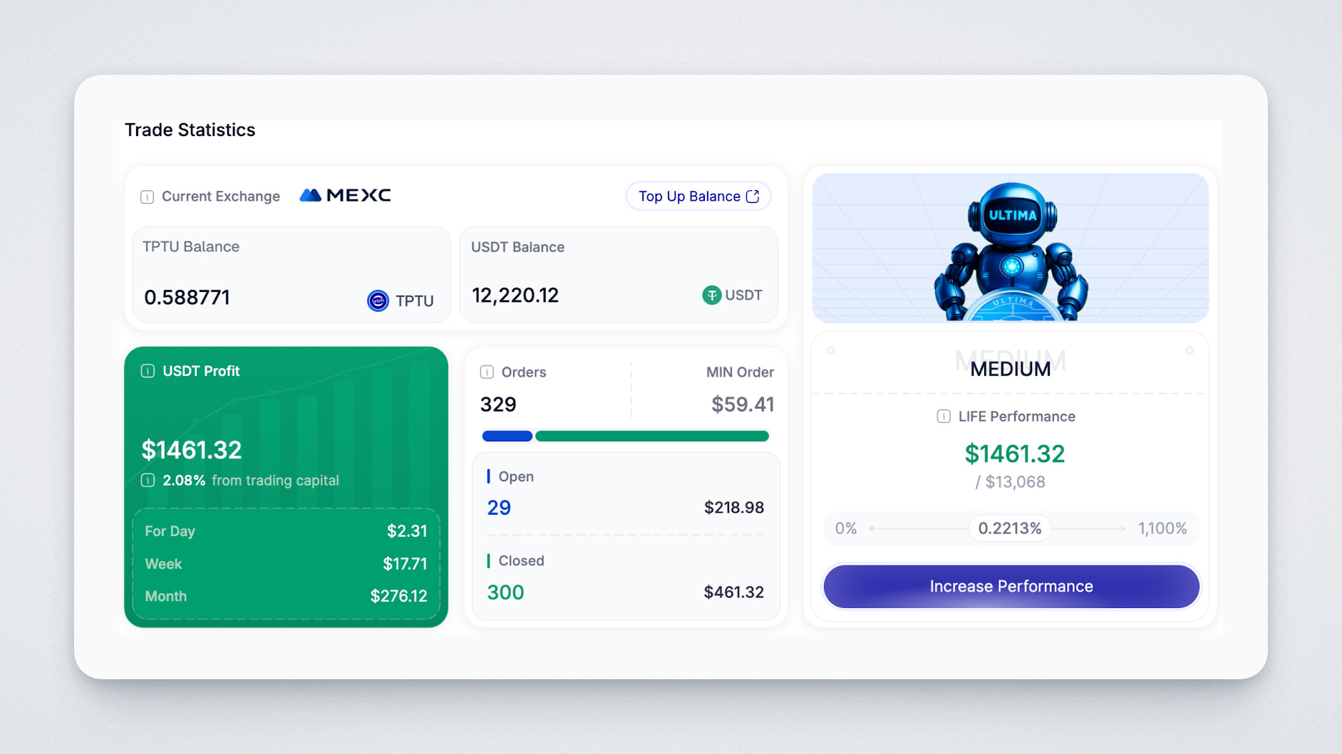 Уважаеми потребители! С радост ви представяме продукт от новата ера в екосистемата на Ultima — платформата Ultima Trading. На нея са достъпни автоматични търговски ботове, предназначени за спот търговия с двойката TPTU/USDT на различни криптовалутни борси. В тази инструкция ще ви обясним как работи търговският бот чрез пример.