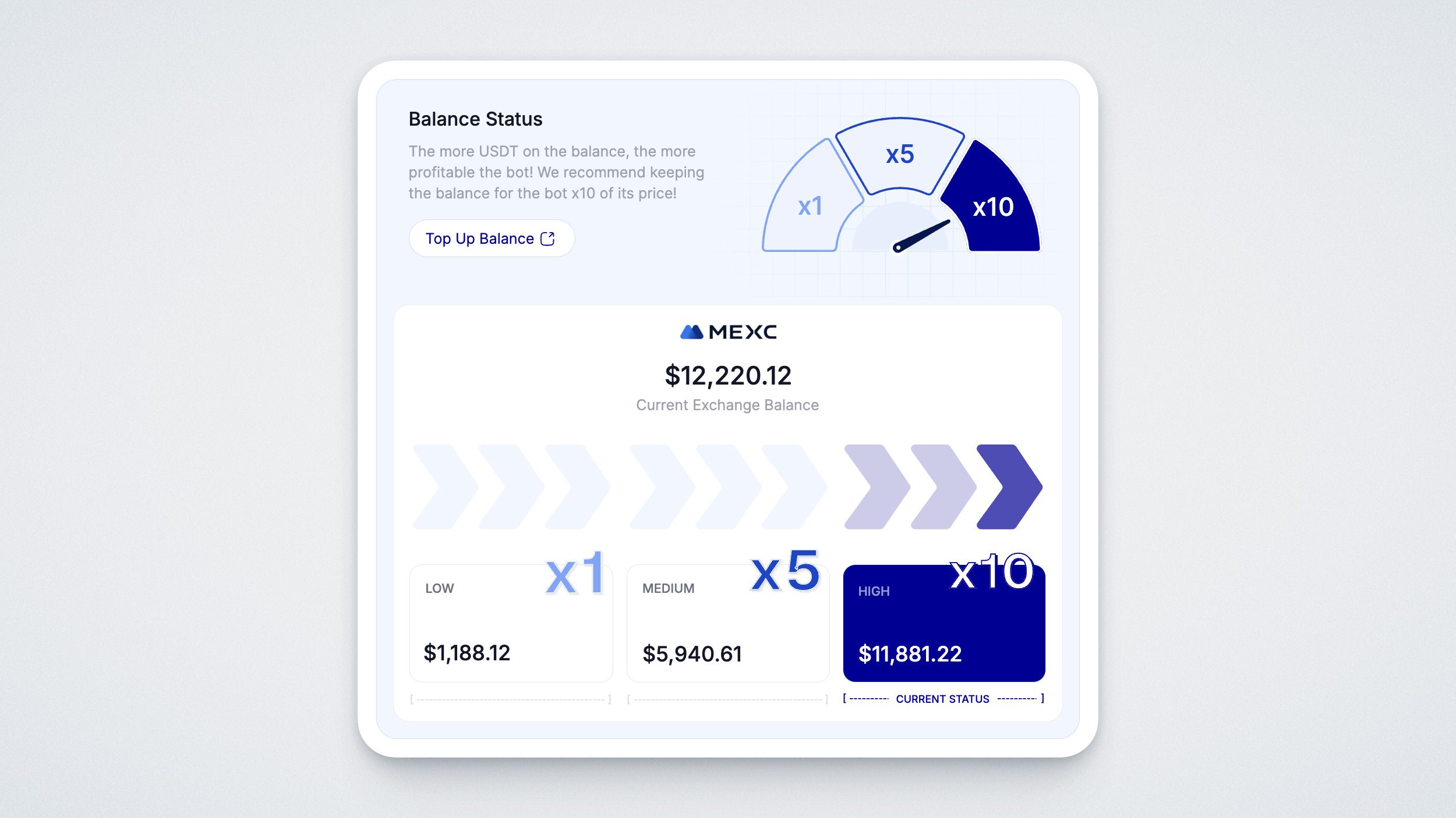 За да може ботът да започне работа, е необходимо да заредите баланс в борсата със сумата, препоръчана за съответния лиценз. За да постигнете максимална ефективност, препоръчваме да захраните акаунта си на борсата със сума, 10 пъти по-голяма от стойността на лиценза. Важно: Ботът ще използва целия наличен баланс в сметката ви на избраната борса, а не само минималната необходима сума. Това е от значение — ботът не може да създава печалба „от въздуха“, той търгува с вашите реални средства.