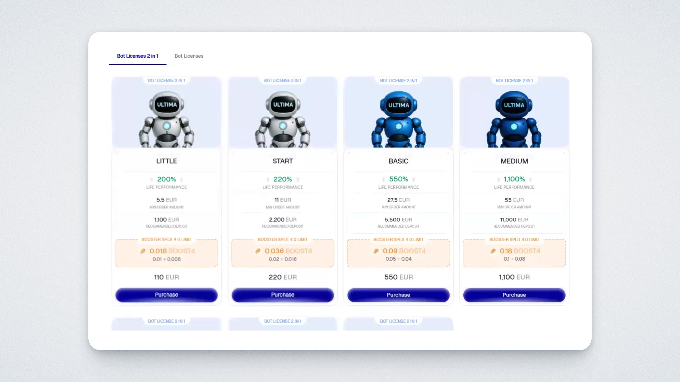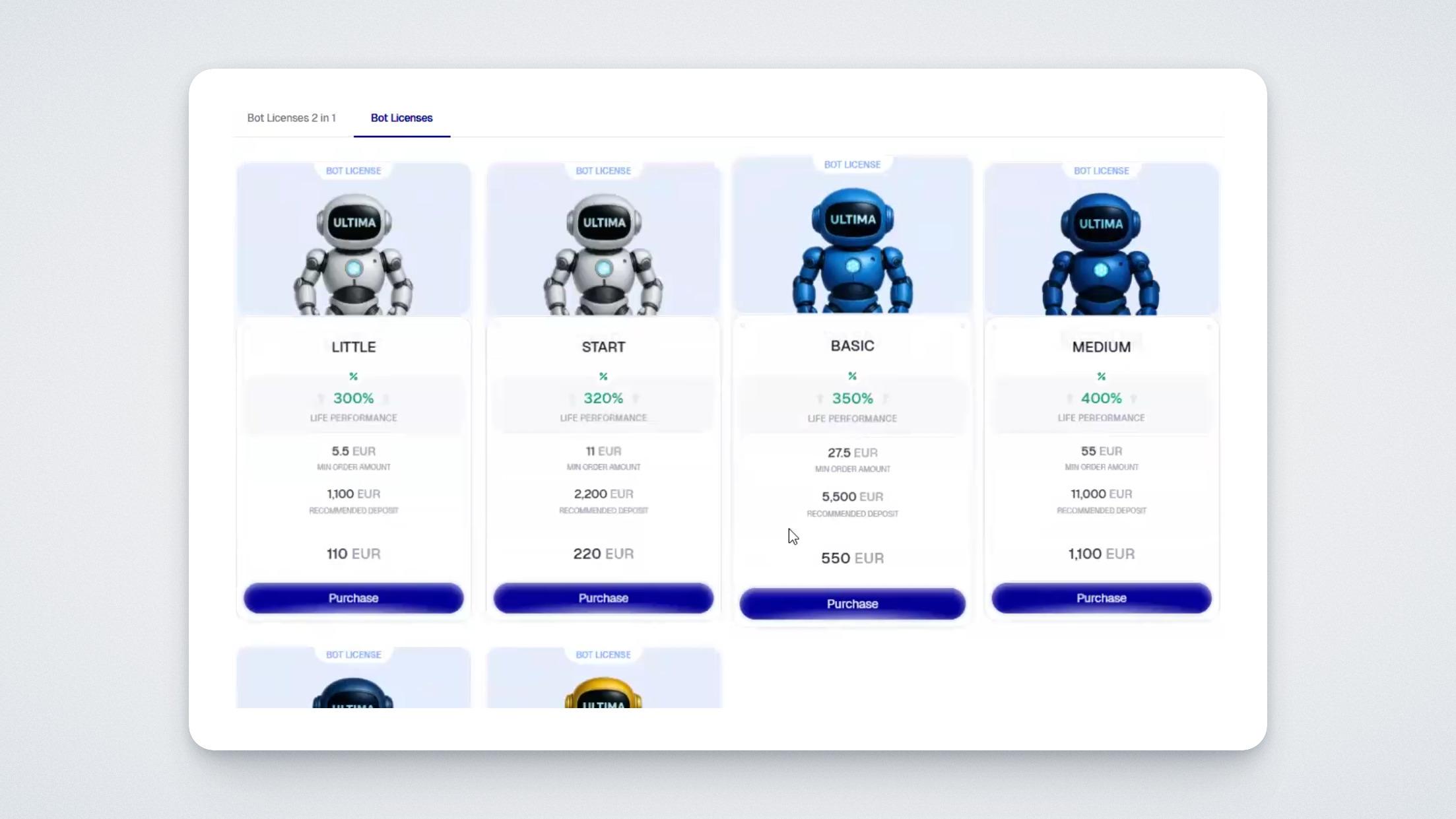В този раздел има общо 7 лиценза, които се различават един от друг по цена и процент печалба, който ботът ще генерира, преди да приключи работа. Освен това за всеки бот е посочен препоръчителен размер на депозита в борсата.