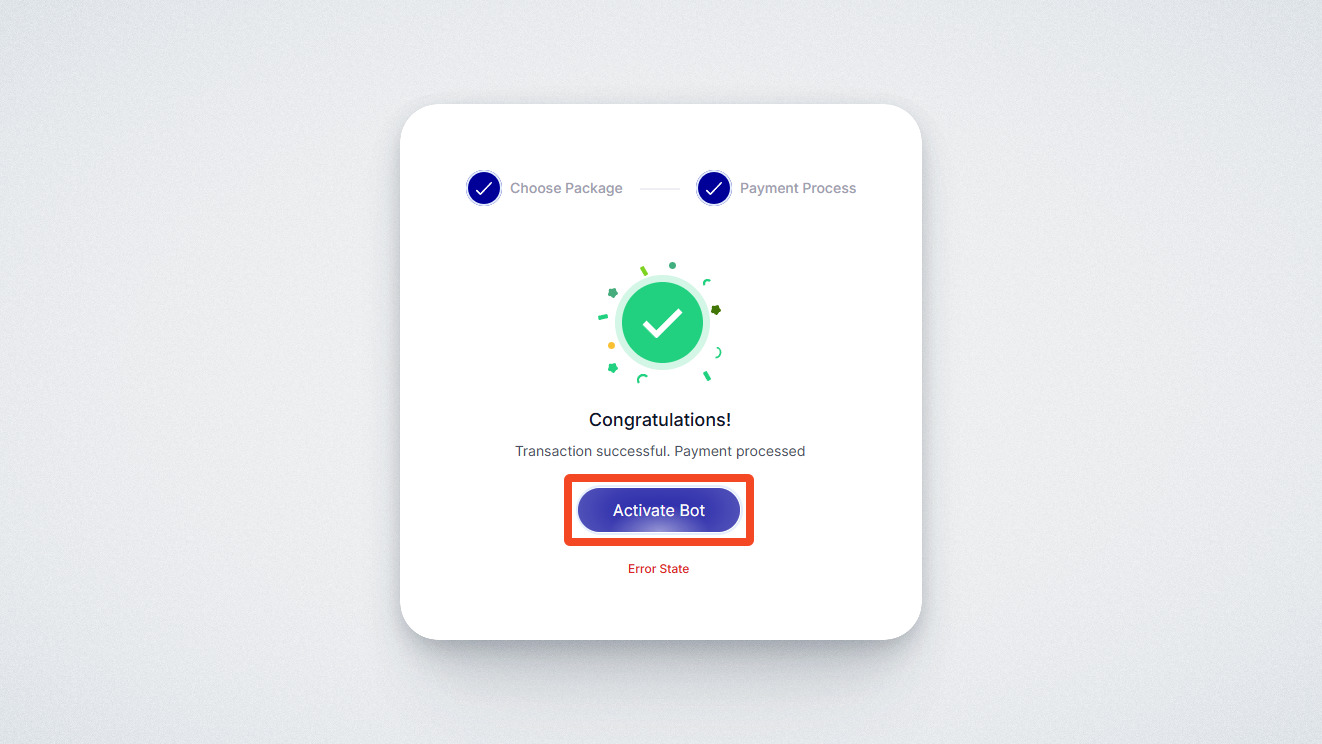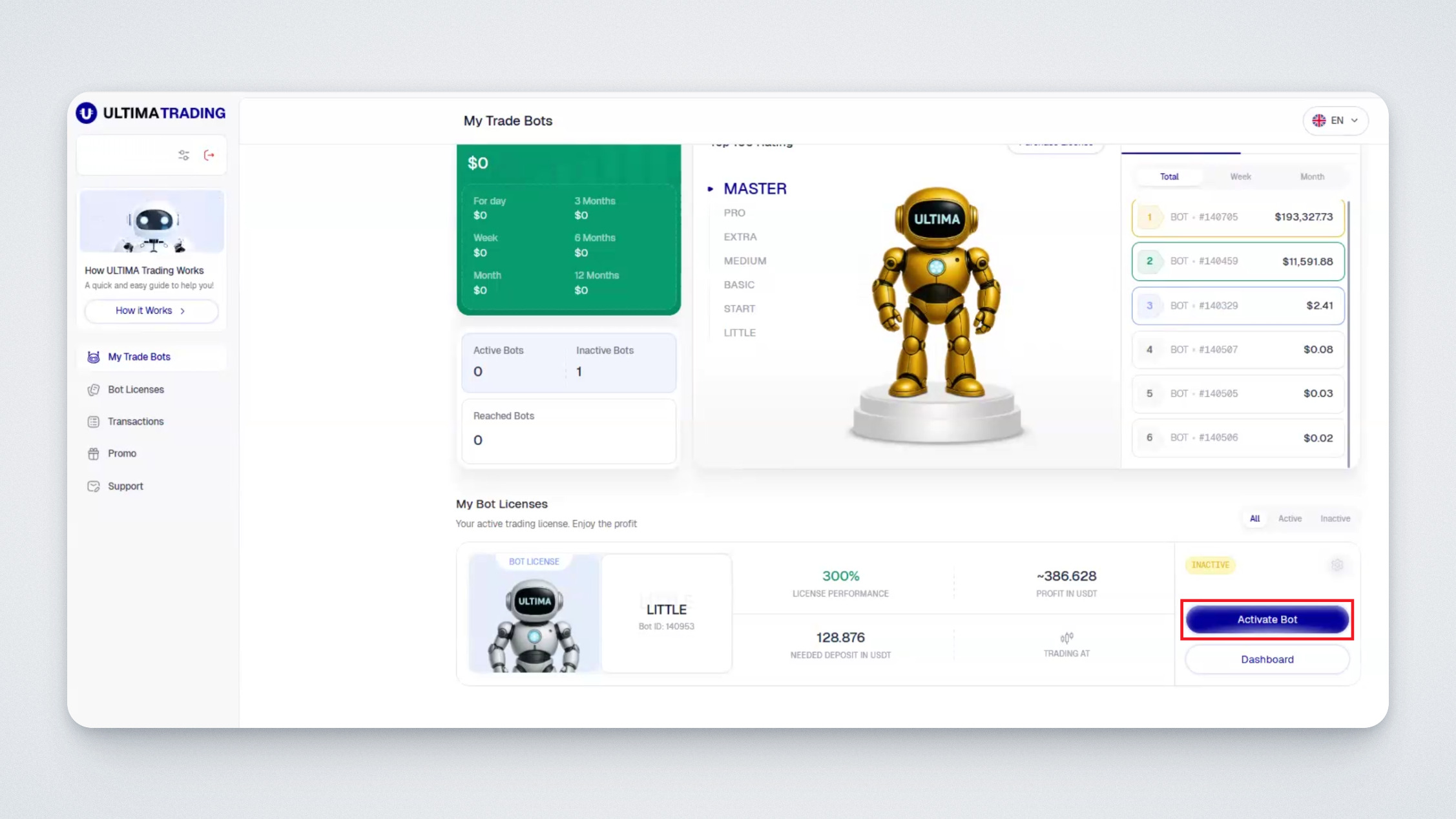 Ботът може да бъде активиран веднага след покупката или по всяко време в секцията „Моите търговски ботове“, както и през таблото за управление.