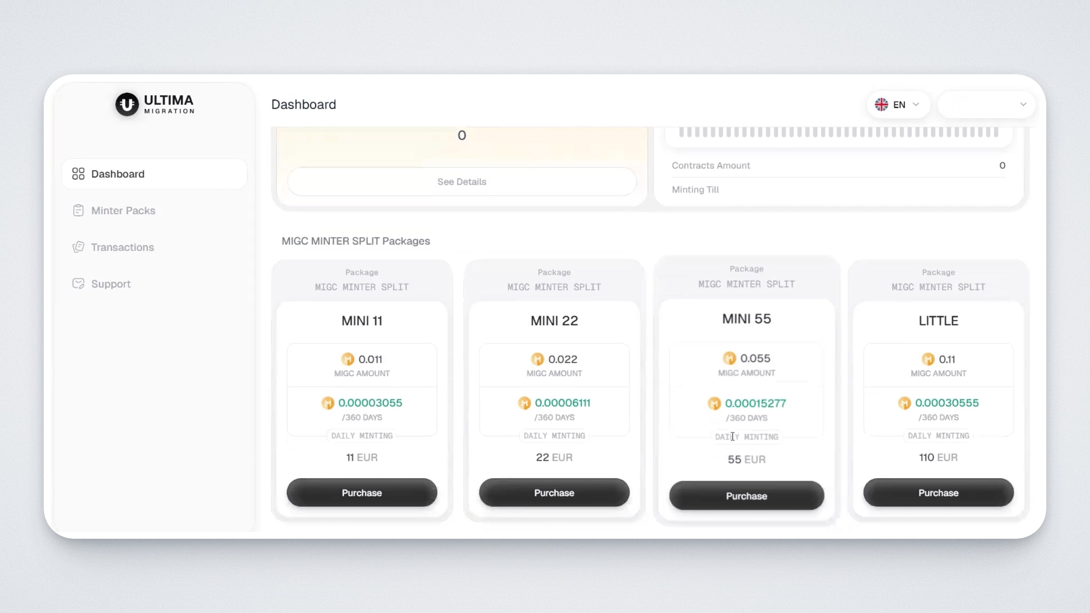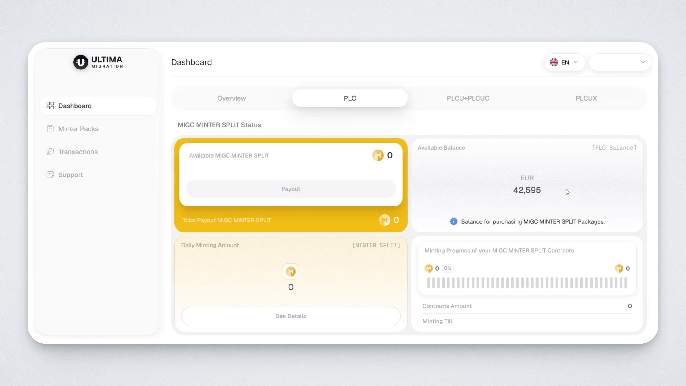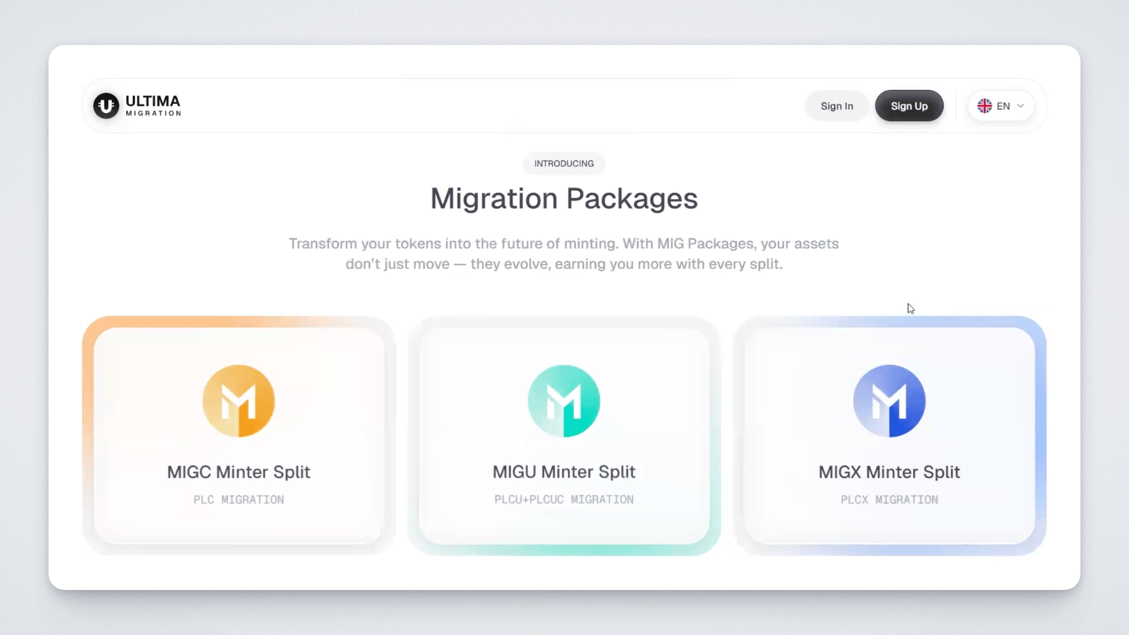 উপস্থাপন করছি Ultima Migration আল্টিমা মাইগ্ৰেশন — একটি অনন্য প্ল্যাটফর্ম যা আপনাকে মিন্টিং চুক্তির বিশেষ প্যাকেজ কিনে নতুন MIGC, MIGU এবং MIGX টোকেন উপার্জন করতে দেয়। এই প্যাকেজগুলির জন্য অর্থ বা টাকা প্রদান করা হয় আপনার PLC, PLCU + PLCUC এবং PLCUX ইউরো ব্যালেন্স থেকে, যা আপনার পূর্ববর্তী প্রজন্মের পণ্যগুলির ঐতিহাসিক ক্রয়ের জন্য এক-এক করে পুরষ্কার দেওয়া হয়েছিলো —ফিয়াট এবং BTC এবং USDT উভয়েই।
