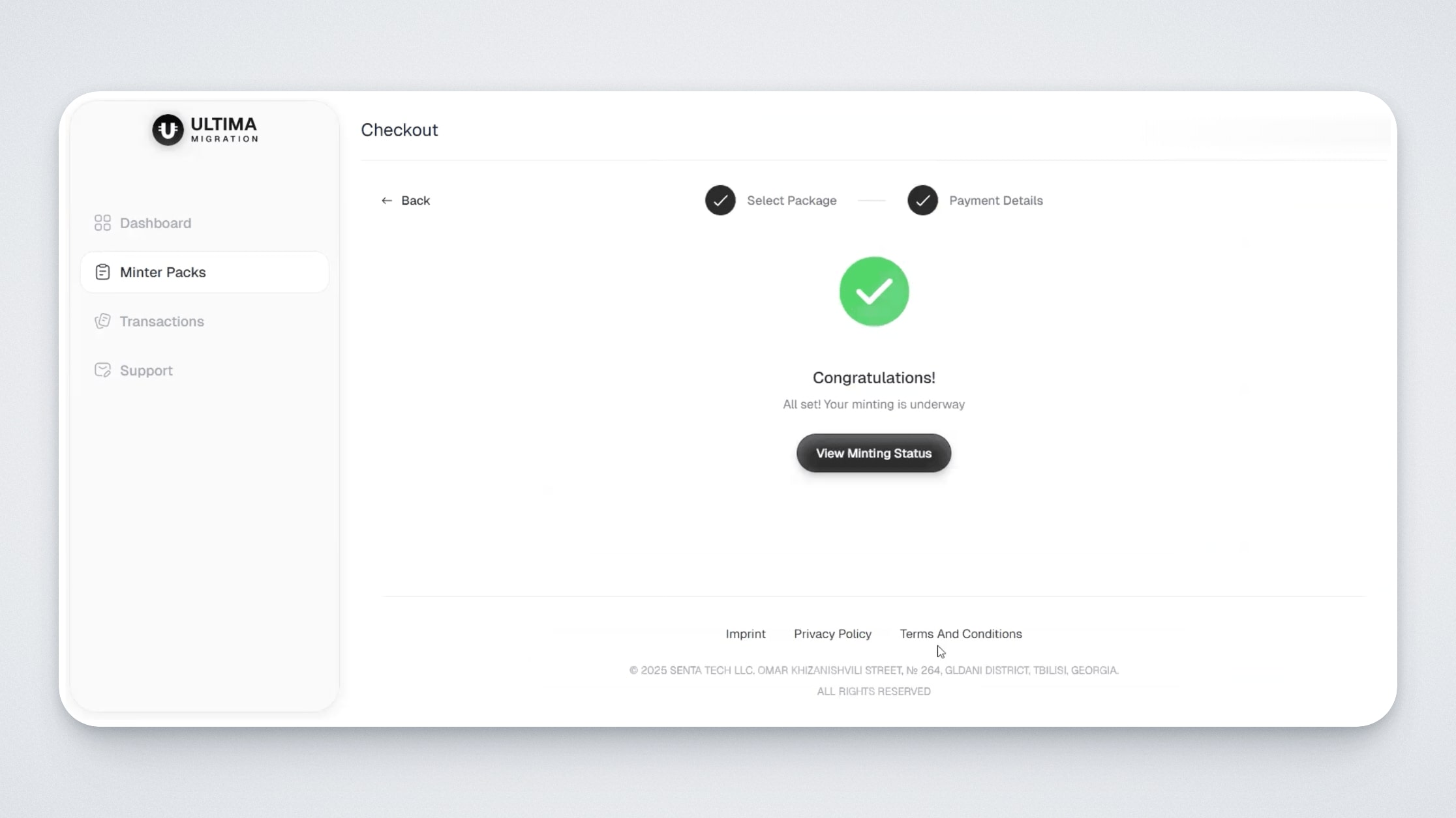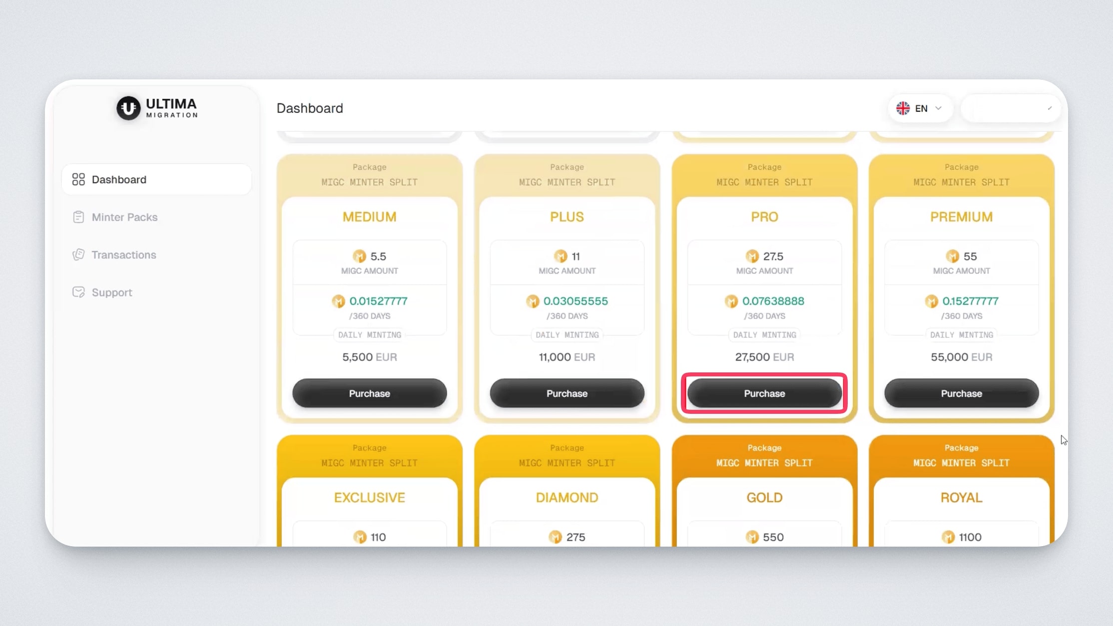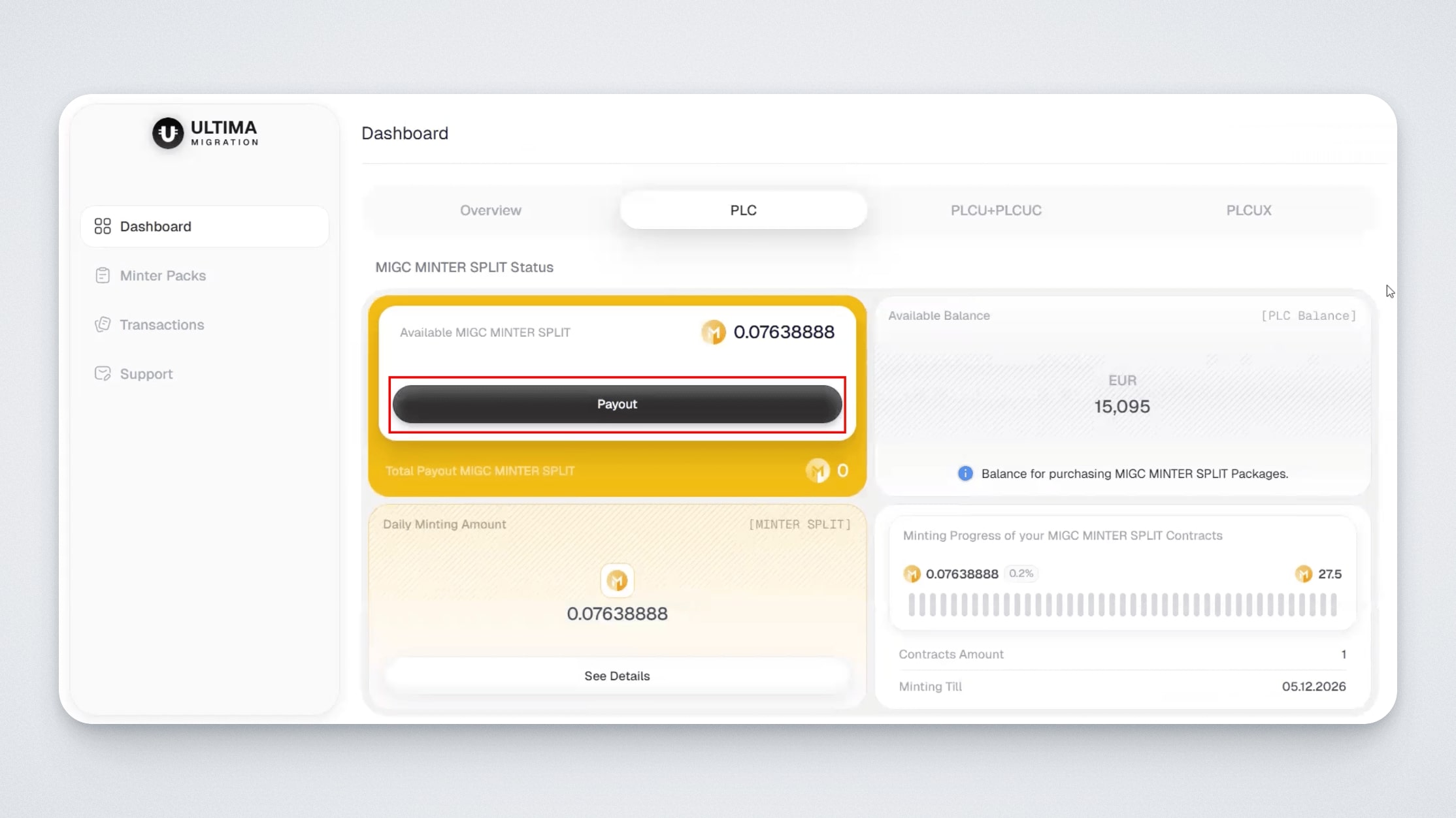 উপস্থাপন করছি Ultima Migration আল্টিমা মাইগ্ৰেশন — একটি অনন্য প্ল্যাটফর্ম যা আপনাকে মিন্টিং চুক্তির বিশেষ প্যাকেজ কিনে নতুন MIGC, MIGU এবং MIGX টোকেন উপার্জন করতে দেয়। এই প্যাকেজগুলির জন্য অর্থ বা টাকা প্রদান করা হয় আপনার PLC, PLCU + PLCUC এবং PLCUX ইউরো ব্যালেন্স থেকে, যা আপনার পূর্ববর্তী প্রজন্মের পণ্যগুলির ঐতিহাসিক ক্রয়ের জন্য এক-এক করে পুরষ্কার দেওয়া হয়েছিলো —ফিয়াট এবং BTC এবং USDT উভয়েই।