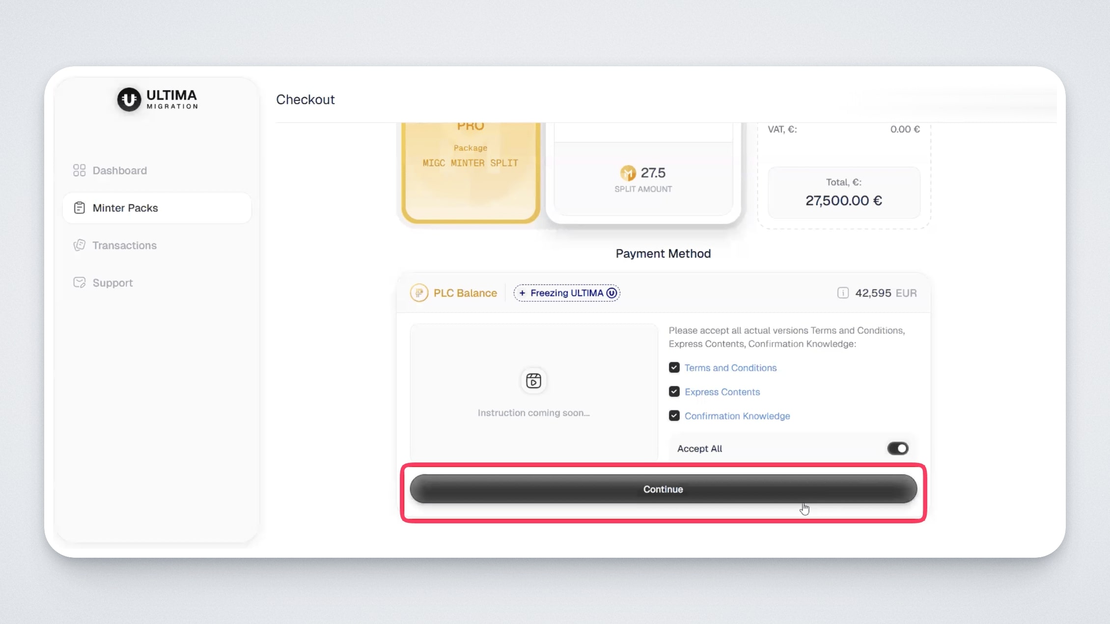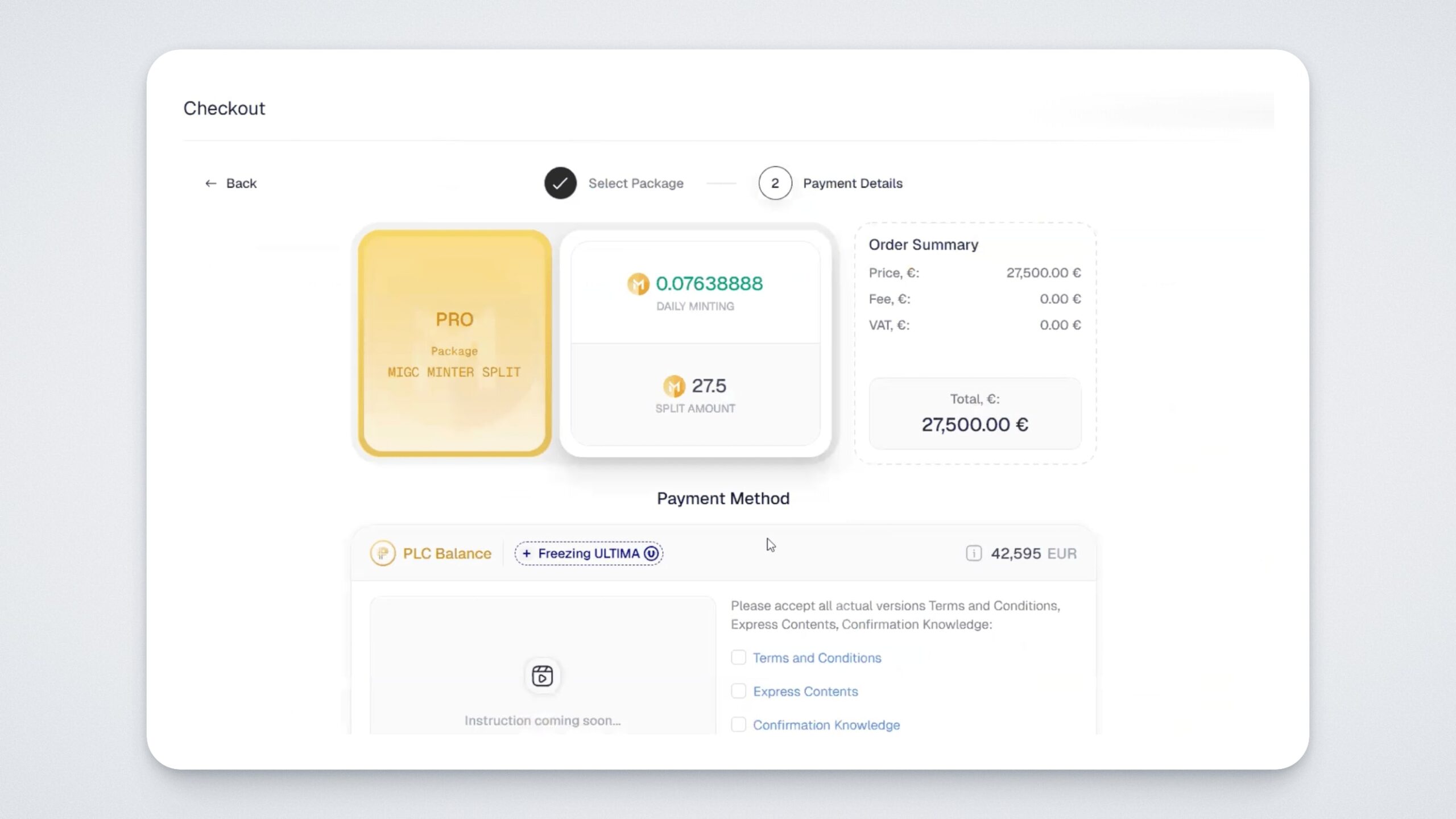 ক্রয় পেজে, অর্ডারের পরিমাণ এবং অর্থপ্রদানের পদ্ধতিটিকে পরীক্ষা করুন। এই ক্ষেত্রে, ULTIMA Frozen আল্টিমা ফ্রোজেন সহ PLC ব্যালেন্স ব্যবহার করে ক্রয় করা হবে।