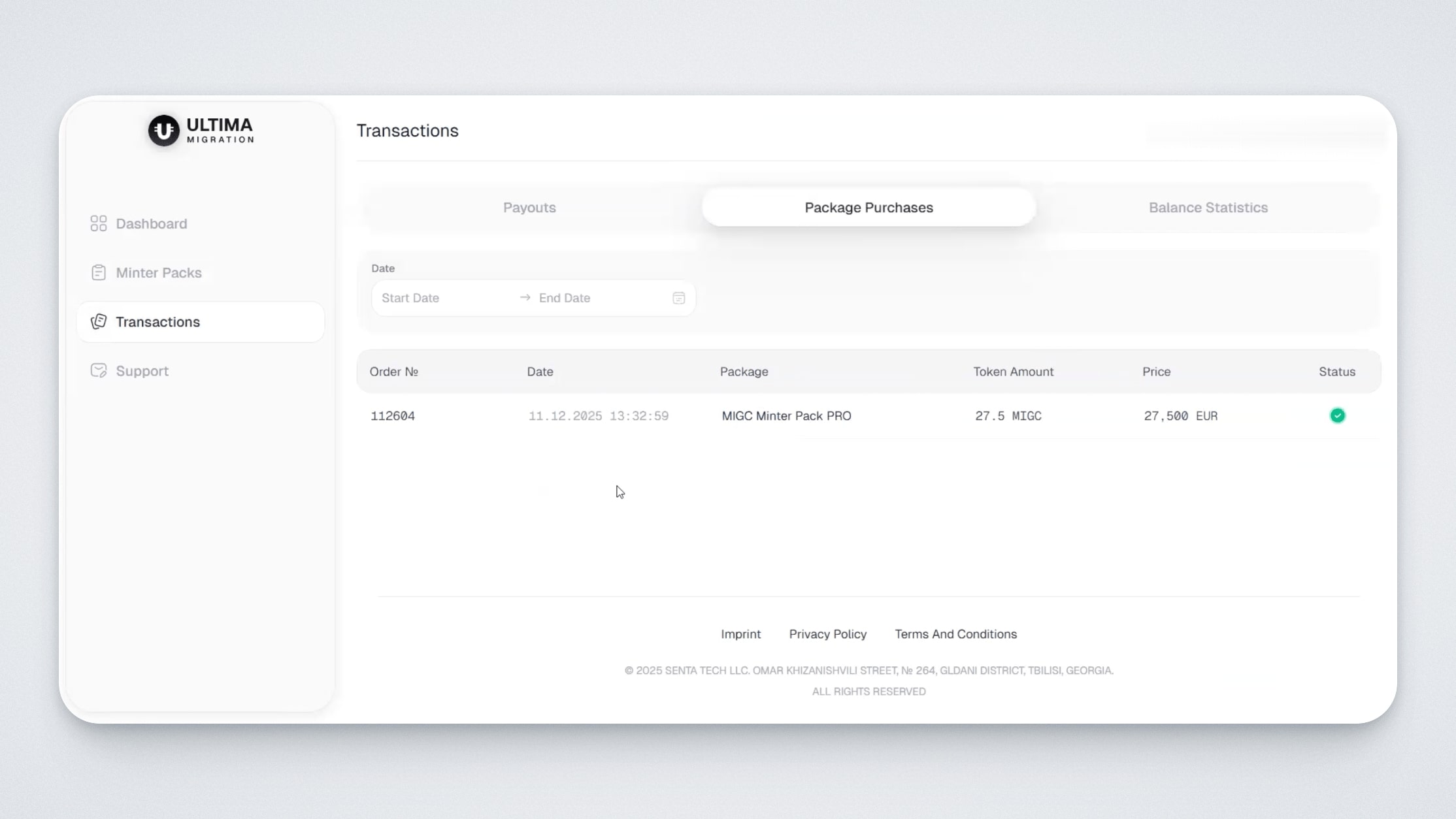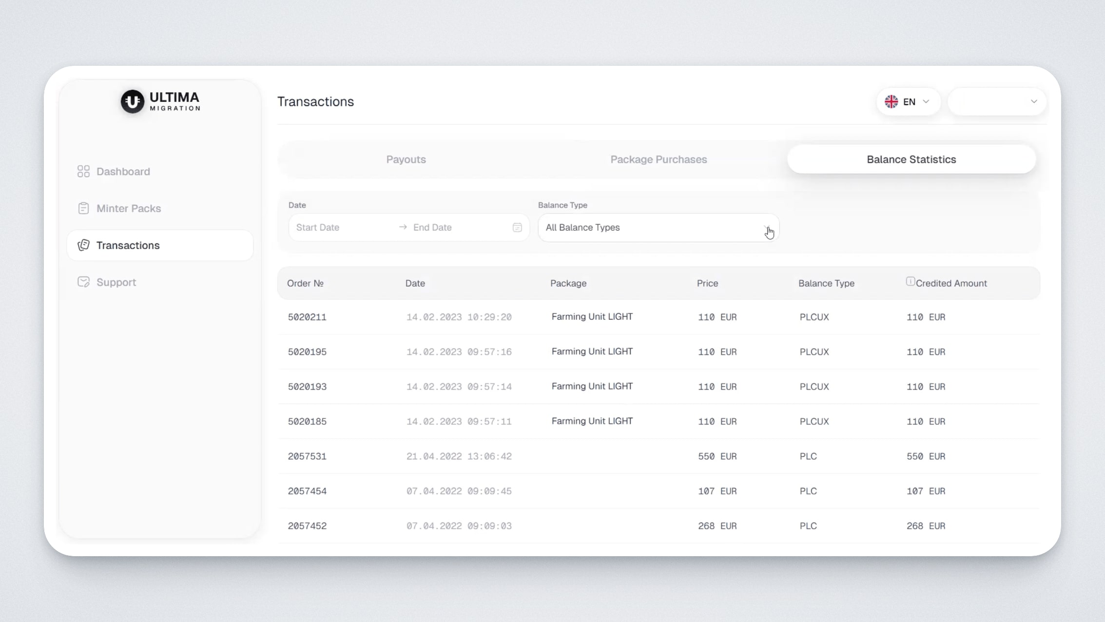 সেখানে আপনি আপনার ব্যালেন্সের ধরণ নির্বাচন করতে পারবেন এবং এটি দ্বারা আপনার ক্রয়গুলিকে ফিল্টার করতে পারেন। এইভাবে, আপনি Ultima Migration আল্টিমা মাইগ্রেশন প্ল্যাটফর্মে ক্রয়ের তারিখ, কেনা পণ্য, পণ্যের মূল্য বা দাম এবং এঁর জন্য জমা হওয়া ব্যালেন্স দেখতে পাবেন:
