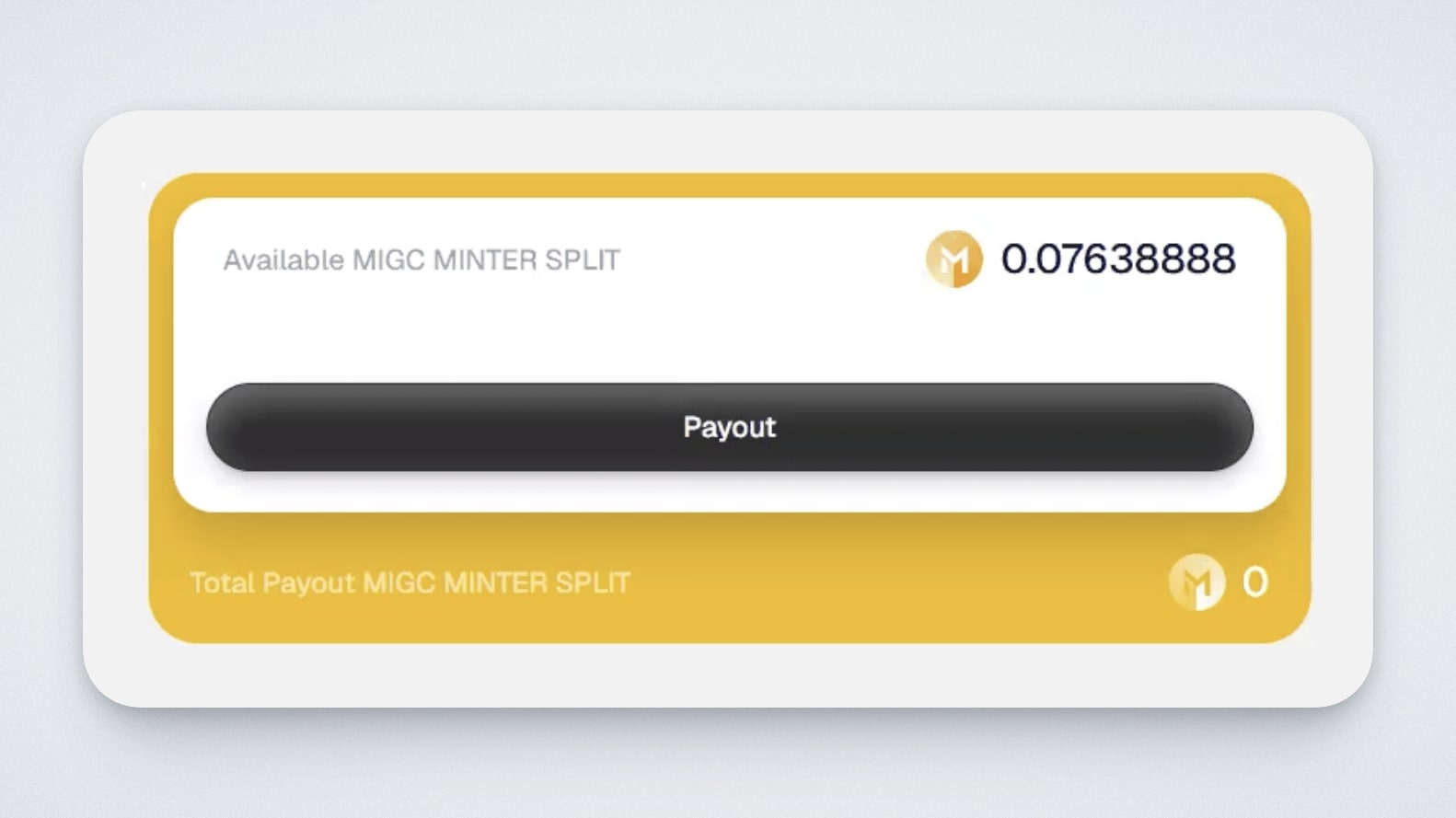 - "উপলব্ধ MIGC MINTER SPLIT" উইজেটটি উত্তোলনের জন্য আপনার উপলব্ধ MIGC টোকেন ব্যালেন্স প্রদর্শন করে।