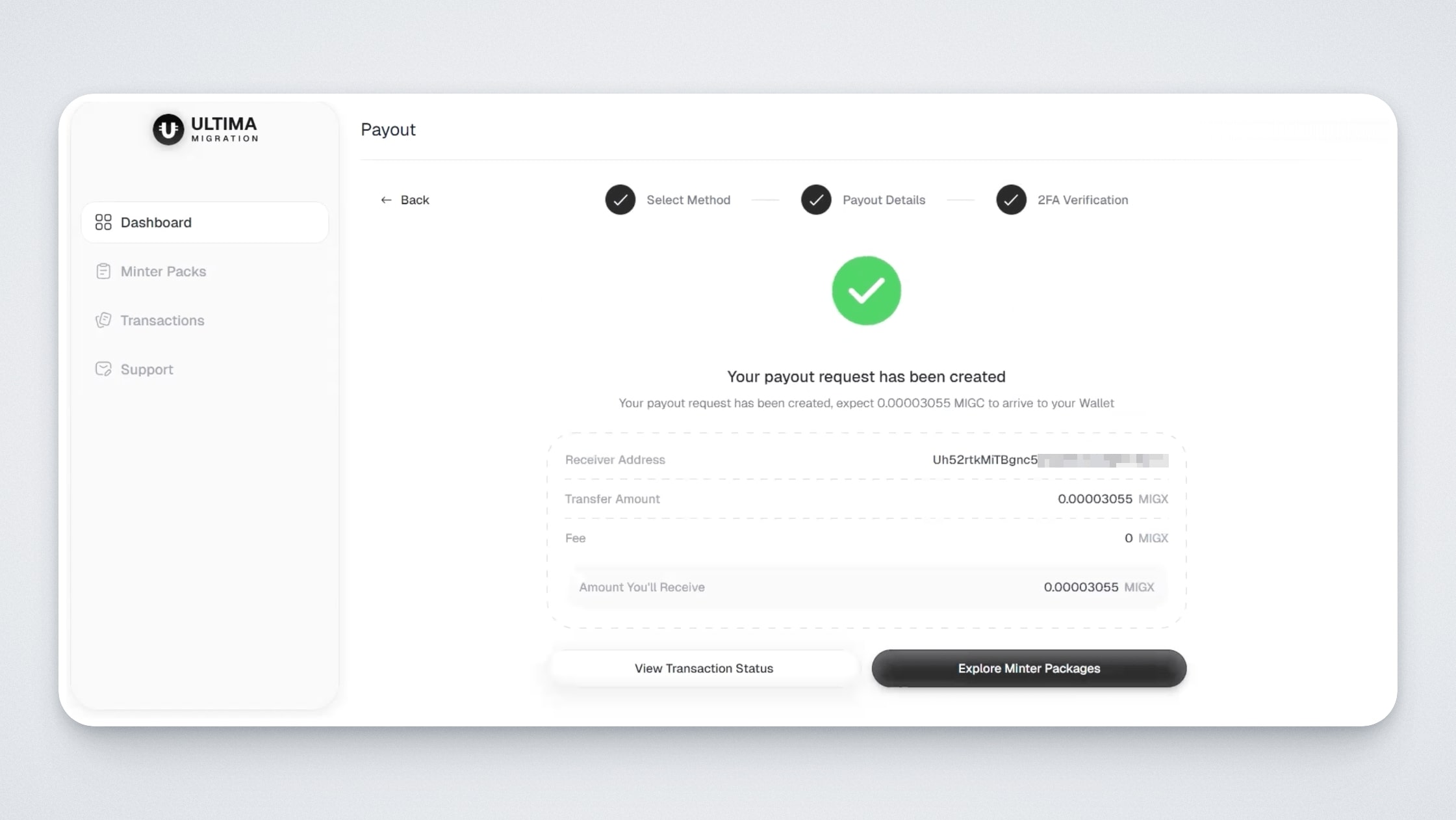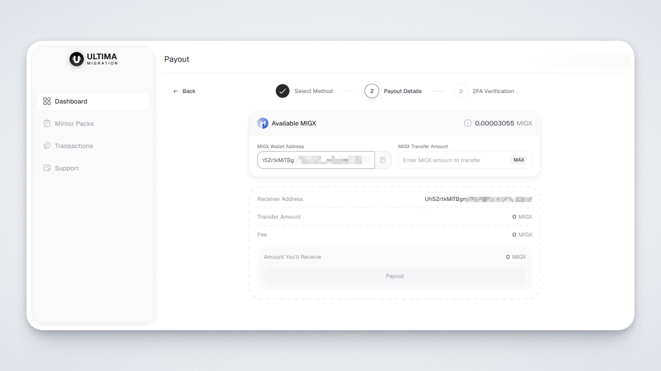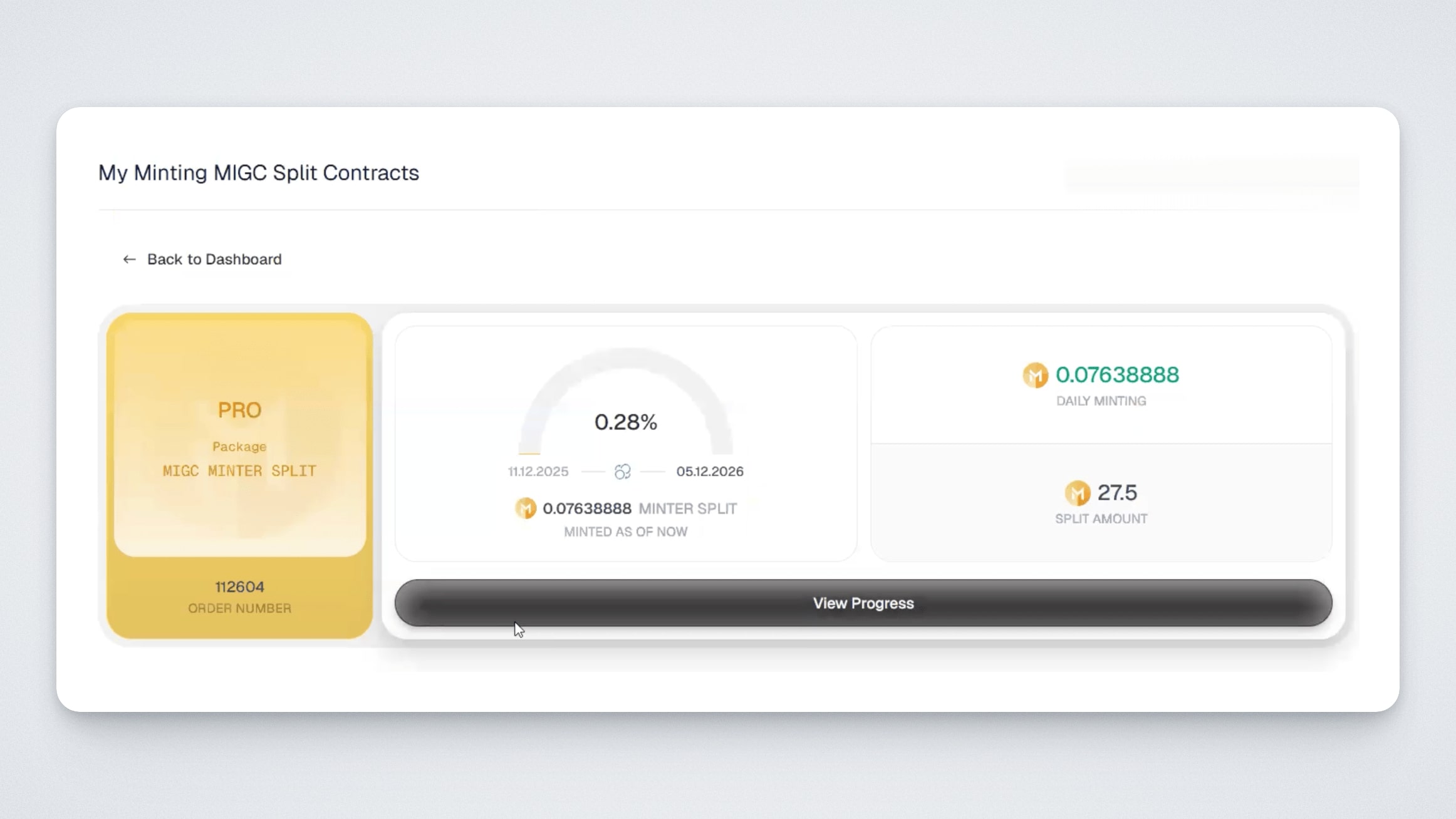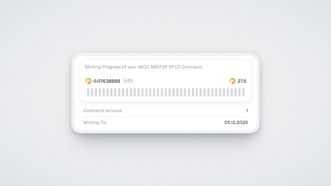- "মিন্টার প্রোগ্রেস" উইজেটটি ক্রয়কৃত প্যাকেজের মধ্যে কতগুলি MIGC, MIGU, অথবা MIGX টোকেন তৈরি করা হয়েছে তা প্রদর্শন করে। "চুক্তির মাধ্যমে কন্ট্র্যাকের পরিমাণ" কলামটি ক্রয়কৃত প্যাকেজের সংখ্যা প্রদর্শন করে এবং (Minting Till) — "মিন্টিং পর্যন্ত" কলামটি ব্যবহারকারী বা ইউজার কতদিন পর্যন্ত তাঁদের পেমেন্ট পাবেন তাঁর তারিখ প্রদর্শন করে।