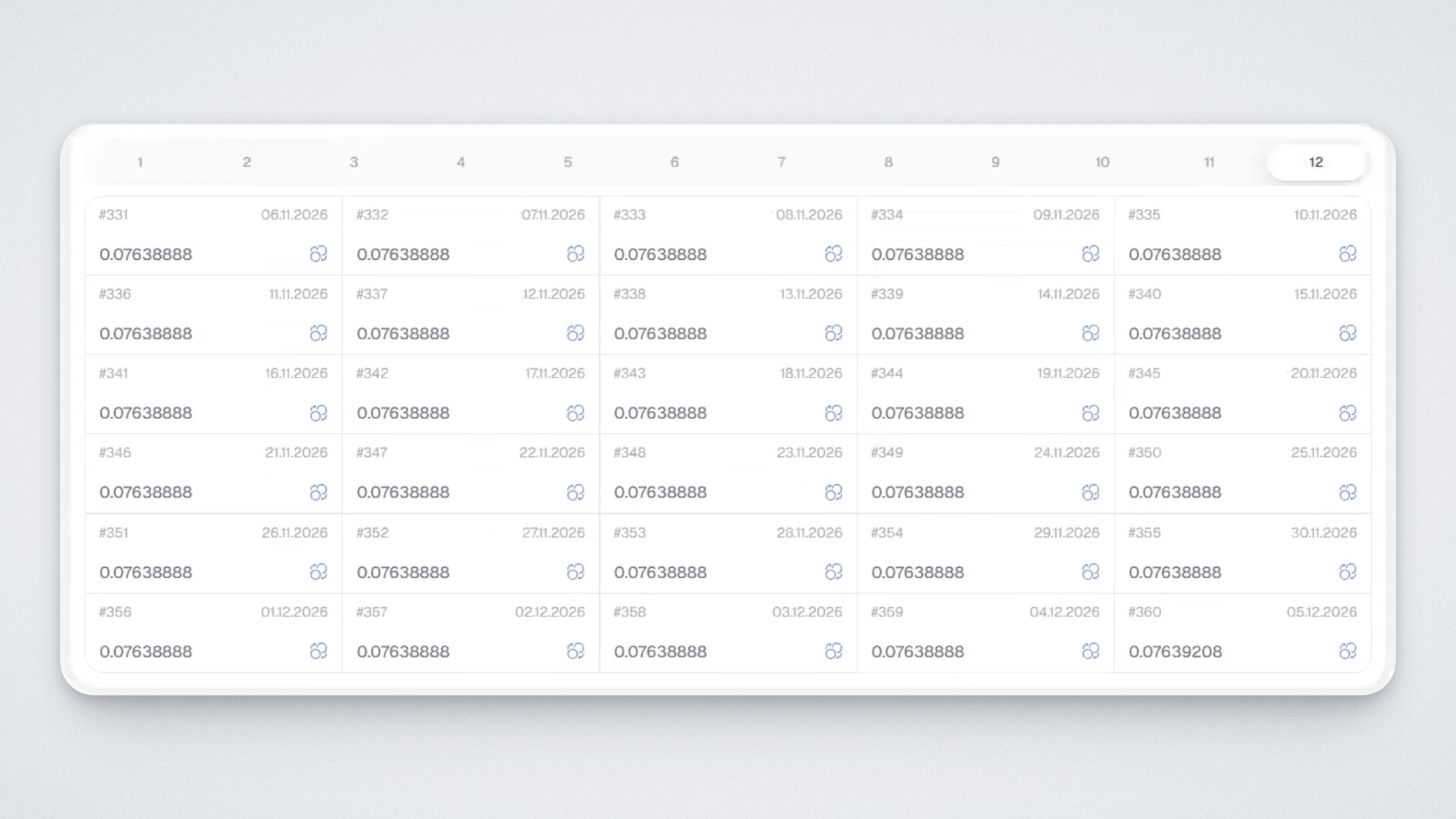 ১২ মাস ধরে প্রতিদিন পেমেন্ট করা হবে, মোট ৩৬০টি পেমেন্টের জন্য। ড্যাশবোর্ডে "মিন্টার প্রোগ্রেস" উইজেটে সম্পূর্ণ পরিমাণটি দেখা যাবে:
