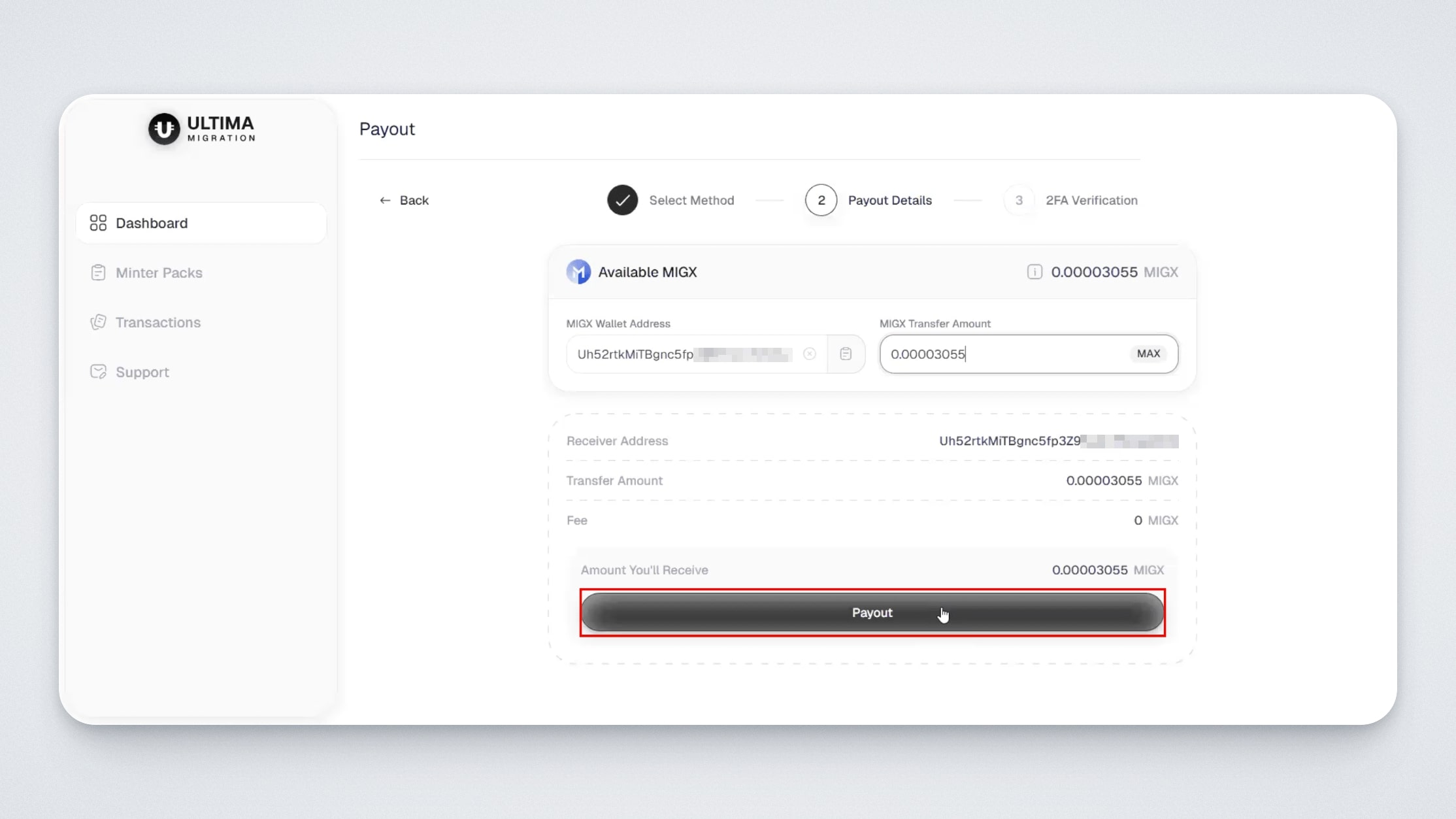 ওয়ালেট এবং পরিমাণটি প্রবেশ করার পরে, স্ক্রিনের নীচে "পেআউট" Payout বোতামে ক্লিক করুন: