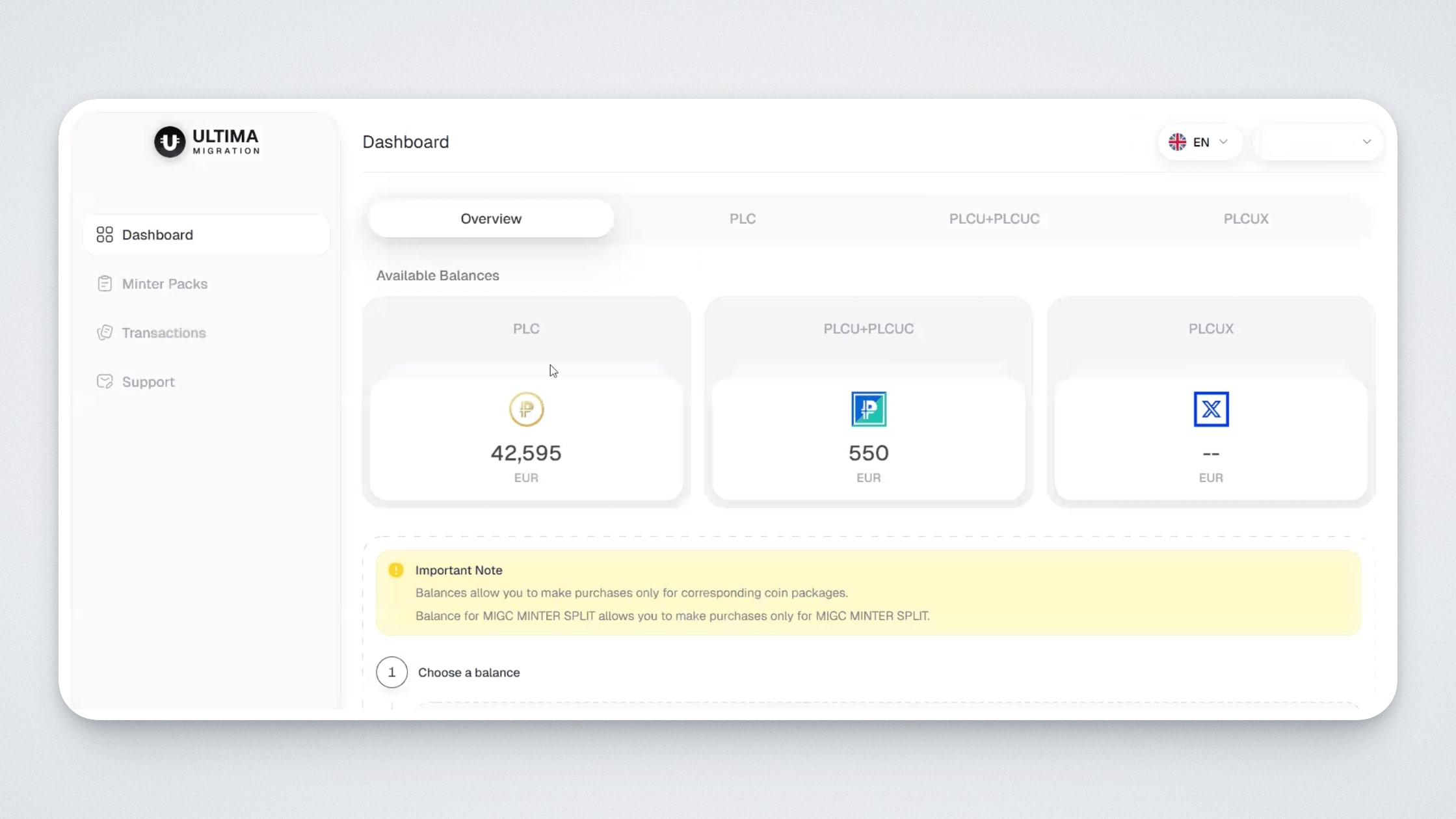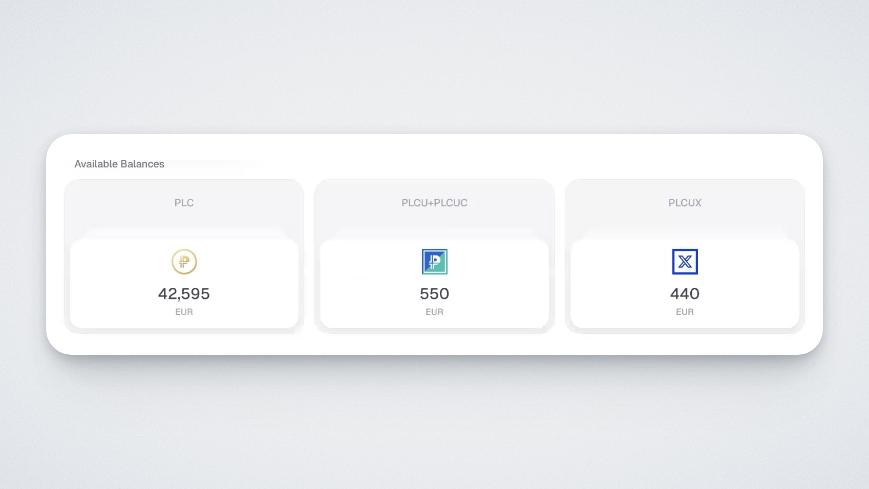মূল পেজে, আপনি তিনটি ইউরো ব্যালেন্স দেখতে পাবেন (গুরুত্বপূর্ণ: PLC/PLCU নয়, বরং ইউরো), প্রতিটিতে একটি সংশ্লিষ্ট লোগো থাকবে। এই ব্যালেন্সগুলি ফিয়াট পেমেন্ট পদ্ধতিটি ব্যবহার করে প্লাটিনকয়েন এবং Ultima Farm আল্টিমা ফার্মে নির্দিষ্ট ঐতিহাসিক কেনাকাটার জন্য, সেইসাথে BTC এবং USDT-এঁর জন্য ইউরোতে এক-এক করে জমা করা হয়। প্রতিটি ব্যালেন্সের নিজস্ব ট্যাব রয়েছে (PLC, PLCU/PLCU Classic, PLCUX)। Platincoin প্লাটিনকয়েন ব্যালেন্স MIGC টোকেনের সাথে যুক্ত, PLCU + PLCUC ব্যালেন্স MIGU টোকেনের সাথে যুক্ত, এবং PLCUX ব্যালেন্স MIGX টোকেনের সাথে যুক্ত।