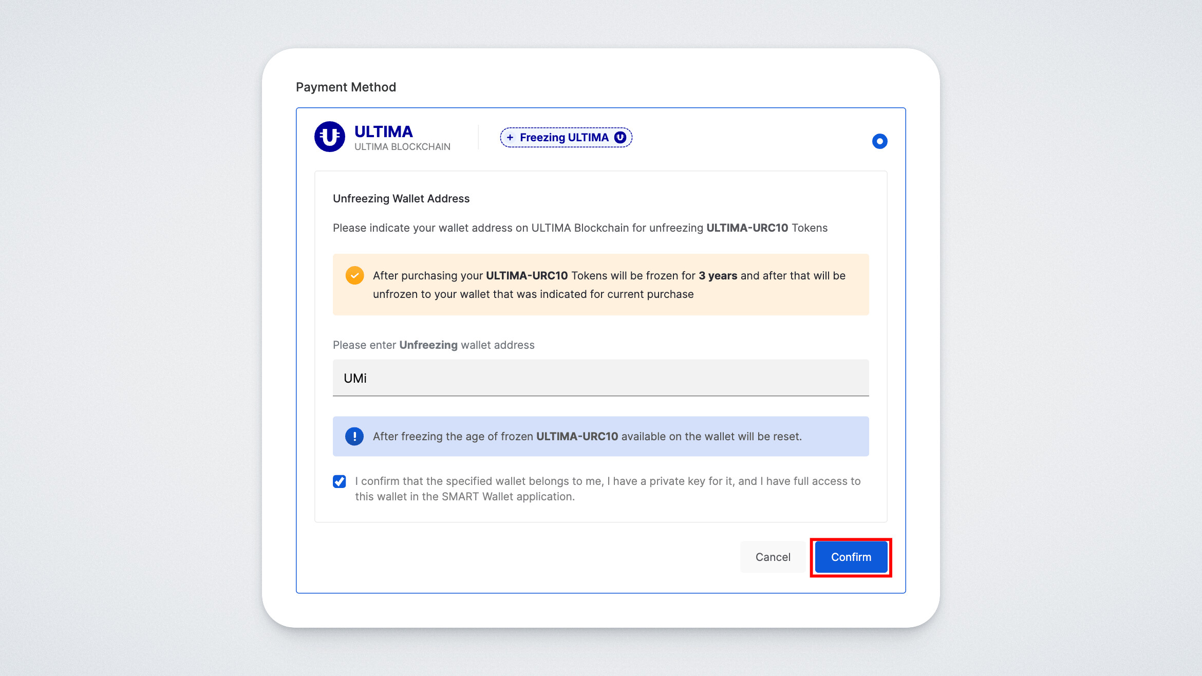 Fontos: a termék befagyasztással történő kifizetése után az ezen a tárcán korábban befagyasztott összes ULTIMA coin nullázódik.