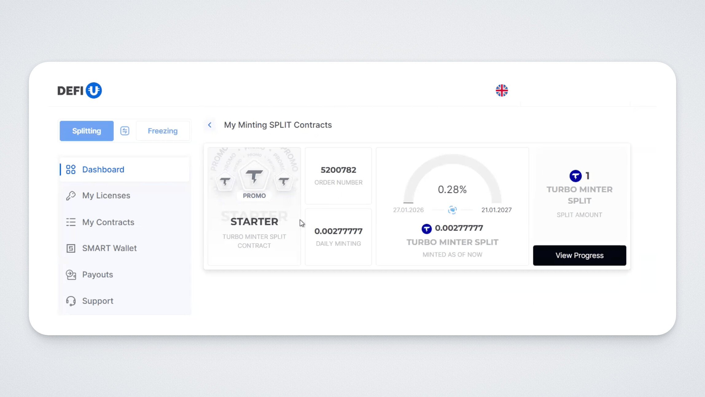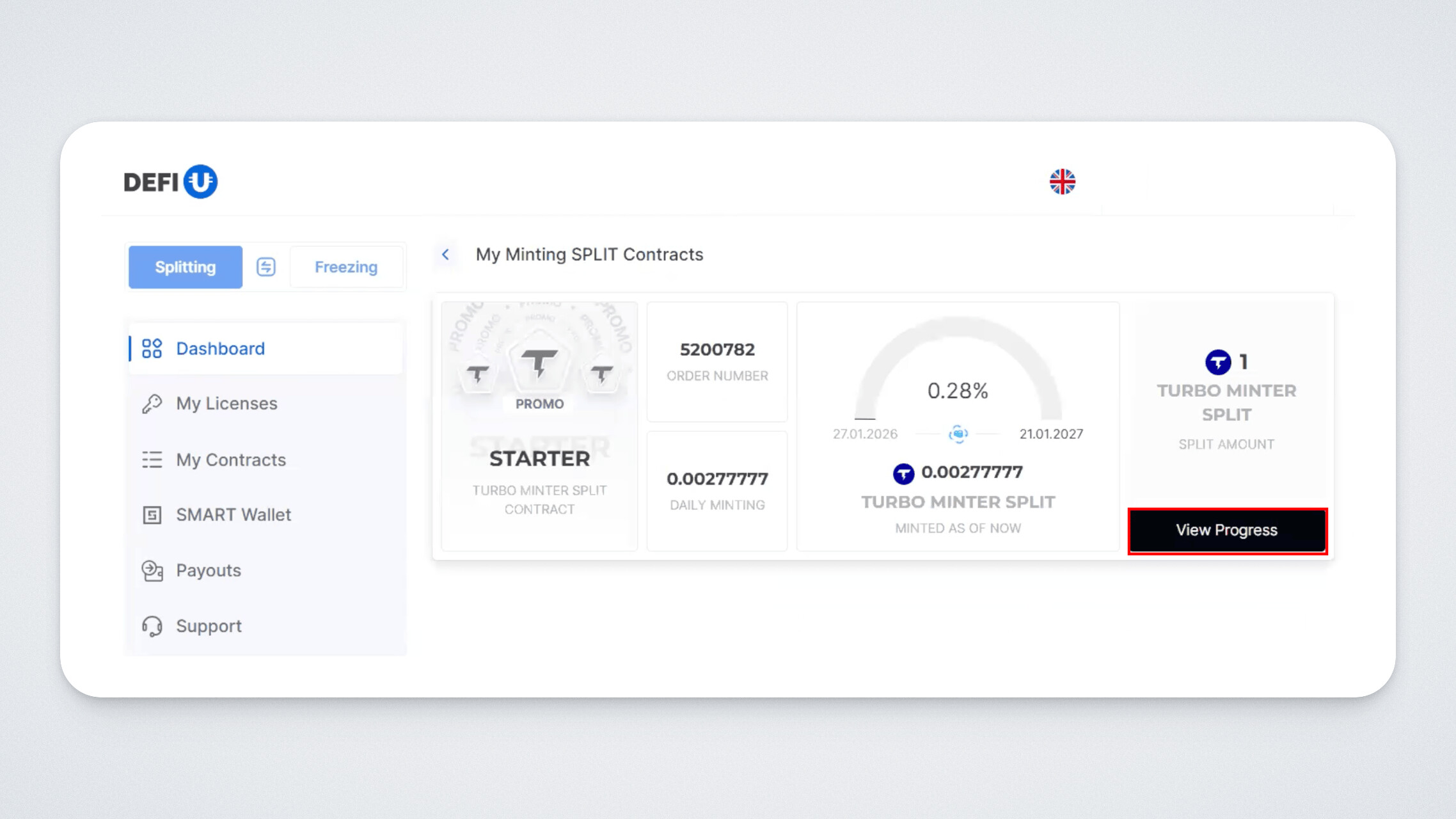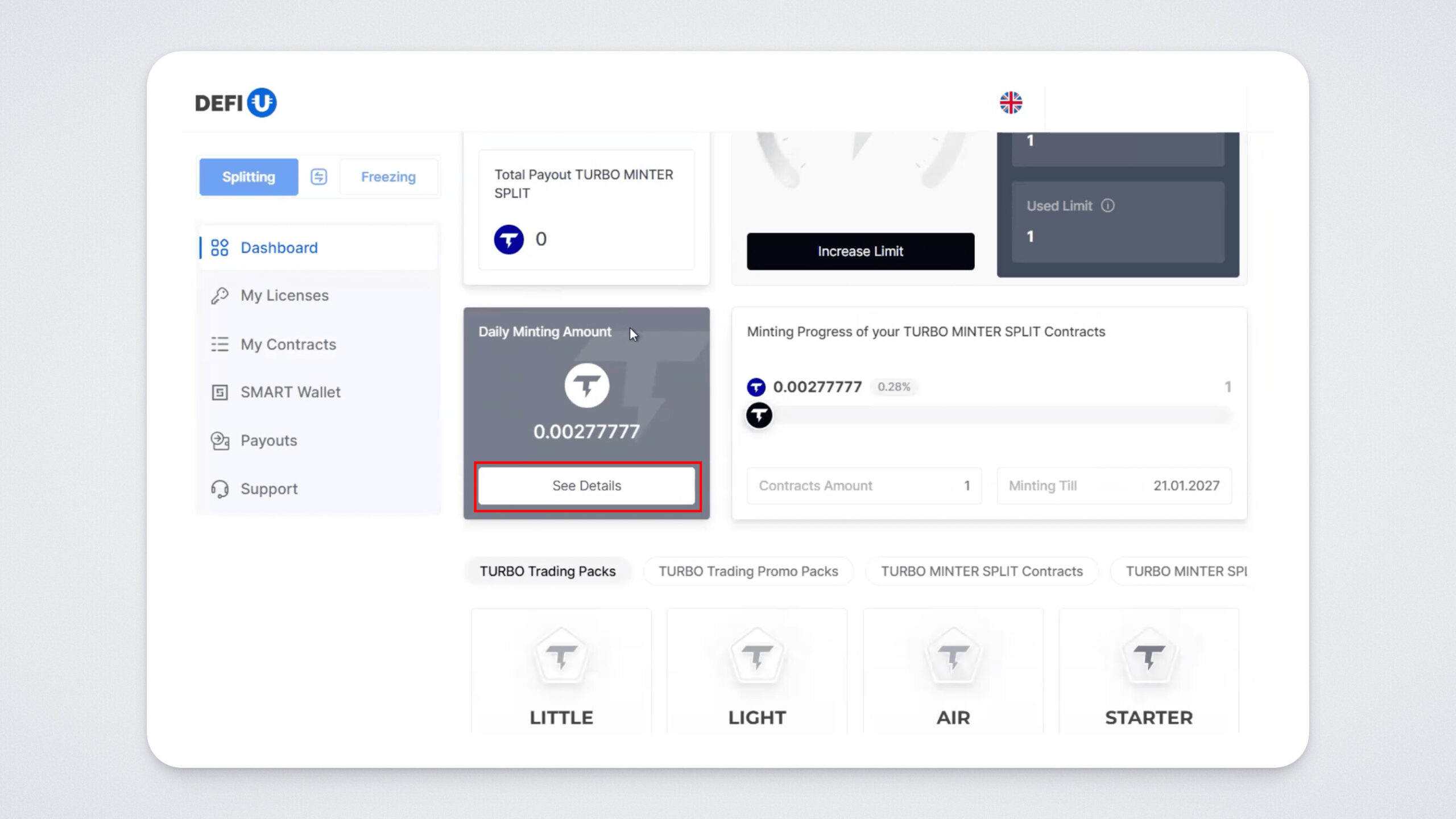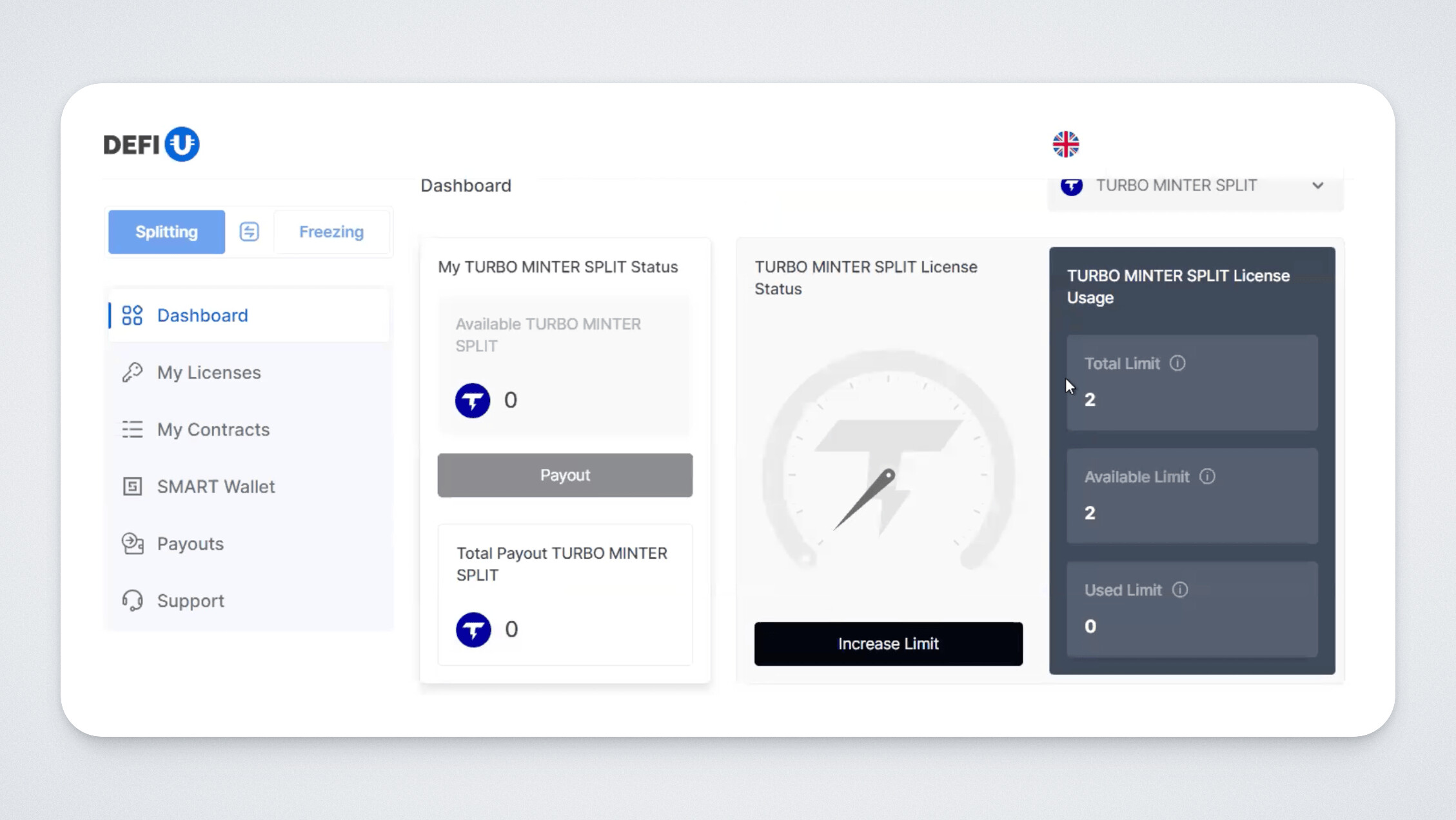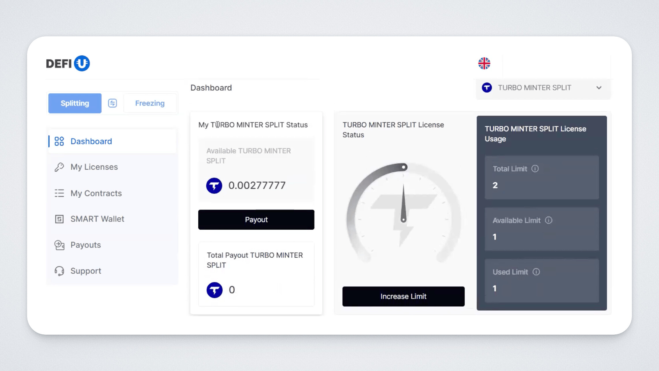 A fizetés után lépjetek át a Defi-U oldalra. A dashboard-on a TURBO MINTER SPLIT License Usage widgeten látni fogjátok a TURBO-limit módosított értékeit: