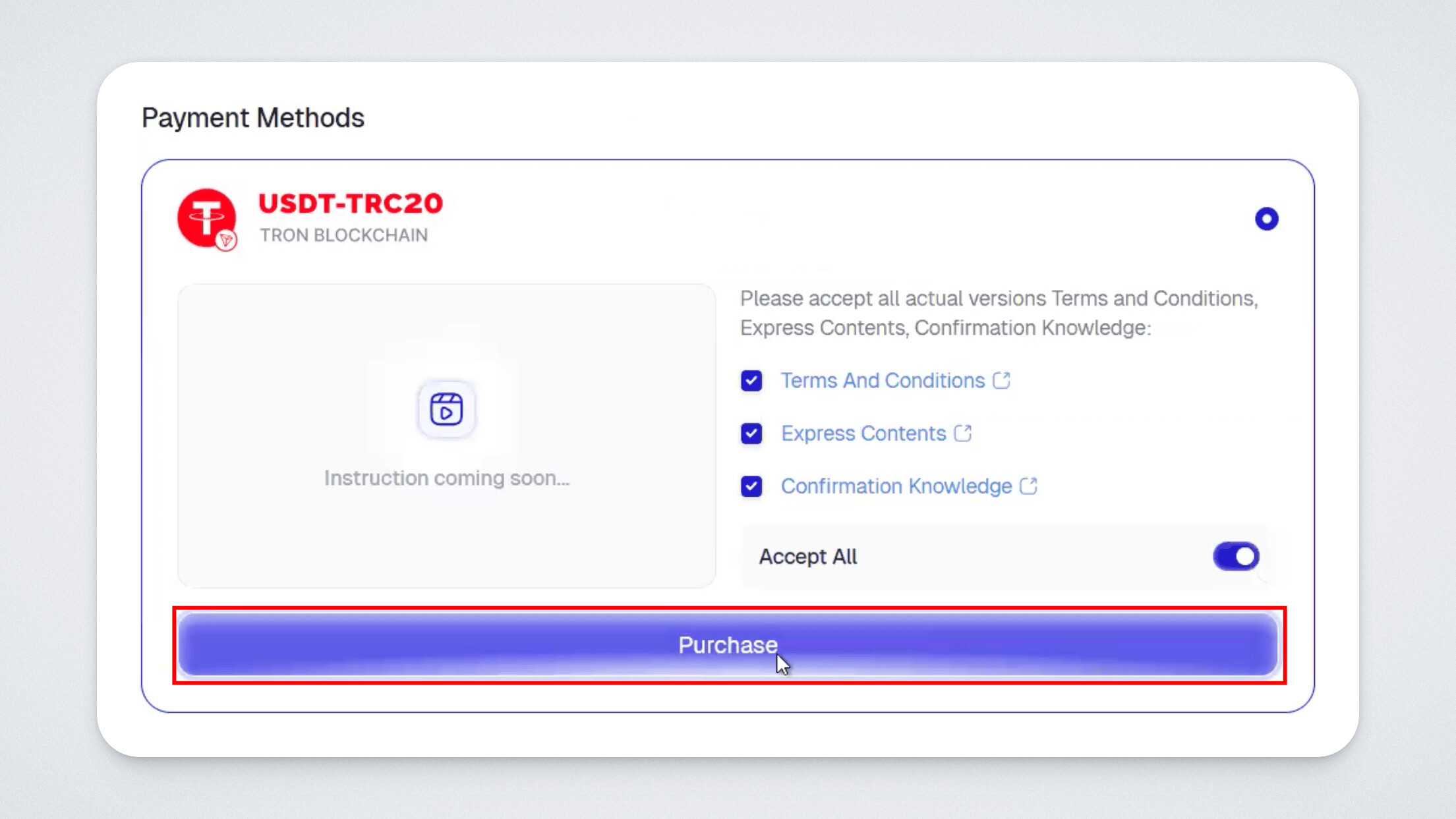 Válasszátok ki az USDT TRC-20 fizetési módot, nyomjátok meg az „Összes elfogadása" gombot, majd nyomjátok meg a „Vásárlás" gombot.