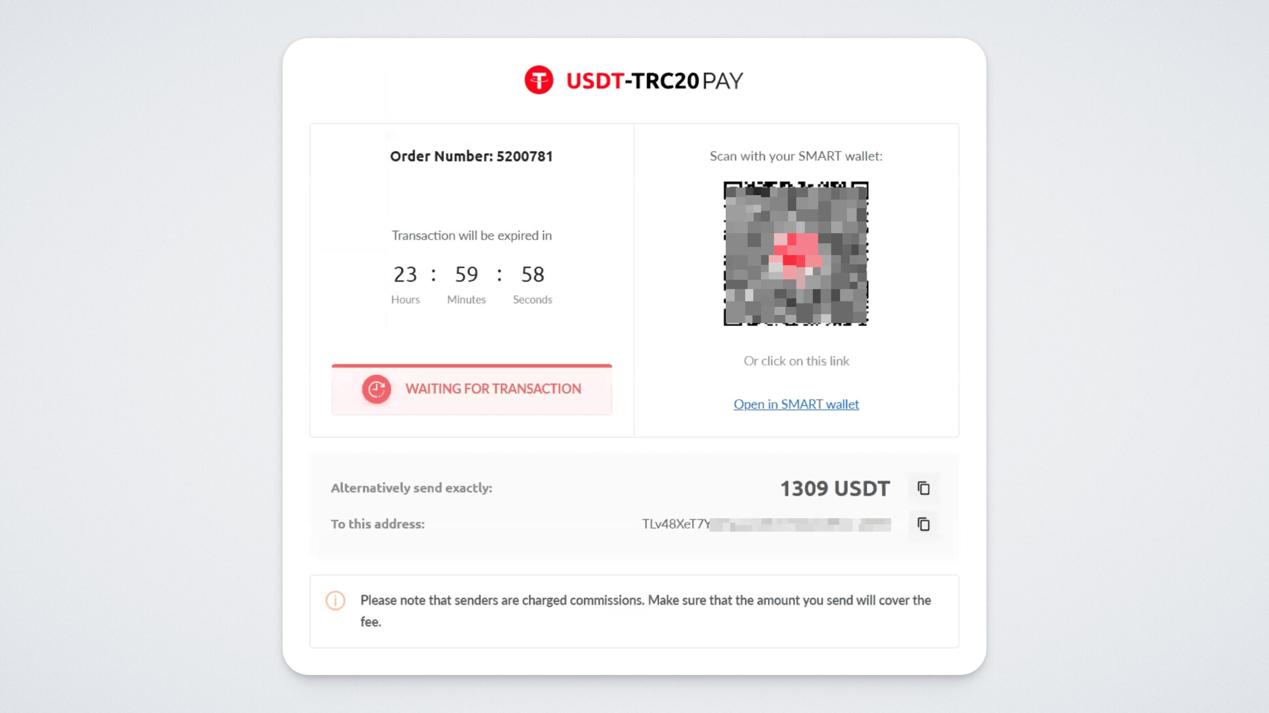 Megnyílik a fizetési mód kiválasztására szolgáló ablak. Jelenleg USDT TRC-20 fizetés érhető el.