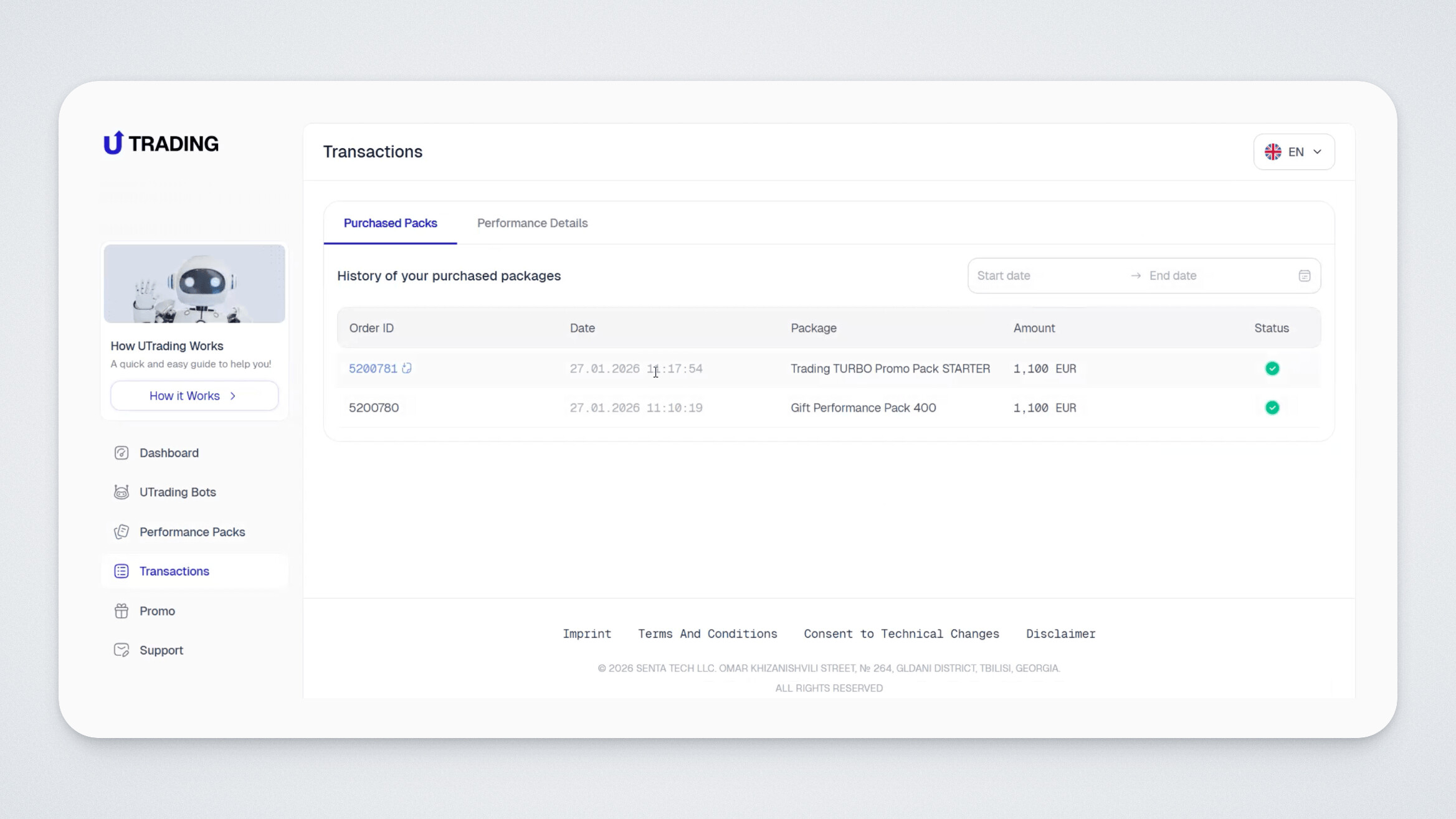 ЧA profit megszerzésének megkezdéséhez 2 lépést kell teljesíteni: meg kell vásárolni a Turbo Trading Pack csomagot a UTrading vagy a Defi-U platformon, majd meg kell kötni a Turbo Split szerződést a DeFi-U platformon ULTIMA befagyasztásos módszerrel. Most nézzük meg a termékeket külön-külön: