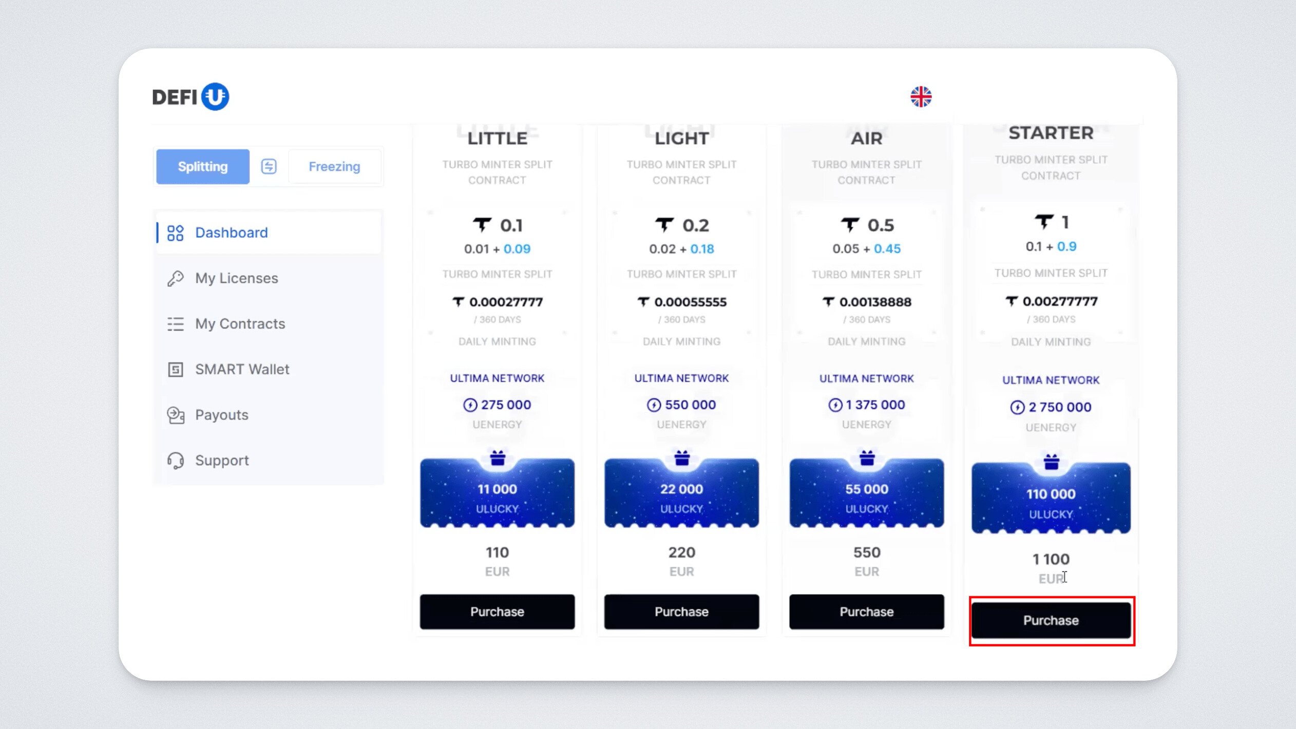 A szerződés megvásárlásához görgessetek le az oldalon és válasszátok a TURBO MINTER SPLIT PROMO Contracts fület. A promó szerződéscsomagok megnövelt mennyiségű TURBO MINTER SPLIT tokent, valamint UENERGY és ULUCKY tokeneket tartalmaznak: mennyiségük a szerződés kártyáján van feltüntetve.